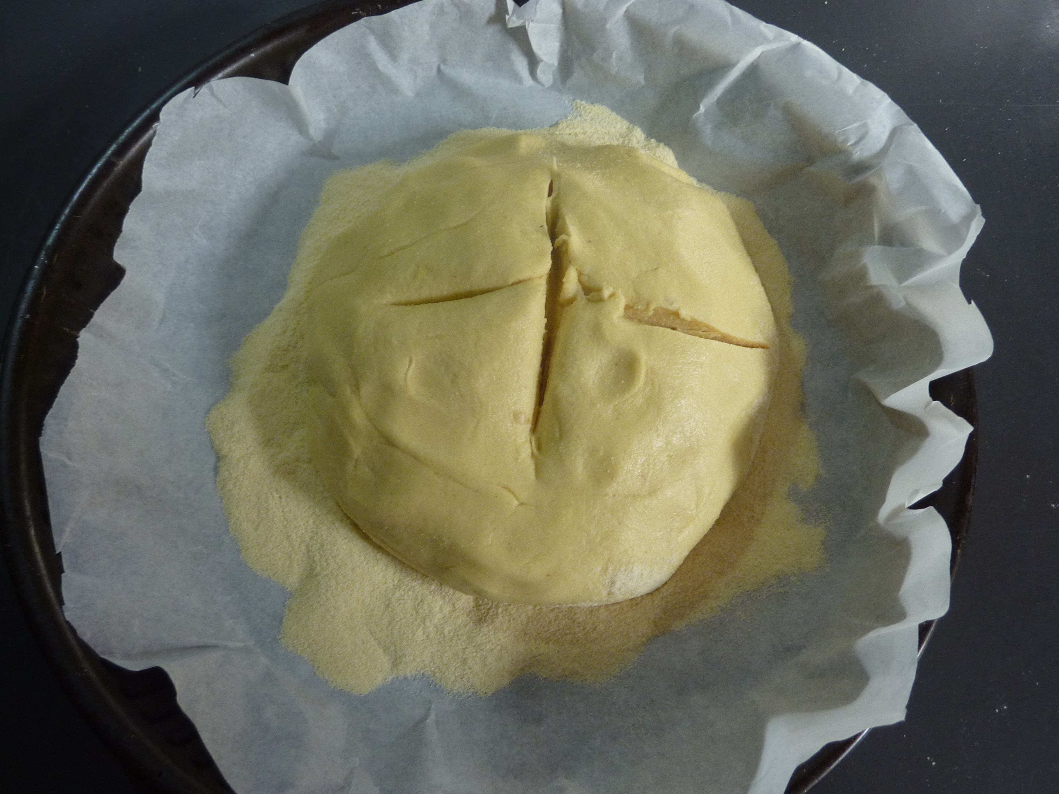 Une fois la boule prête, mettez-la dans un plat à four, avec de la farine au fond pour éviter qu’elle ne colle. Incisez-la sur le haut pour favoriser le développement du levain, pendant au moins deux heures, et couvrez-la d’un chiffon mouillé.