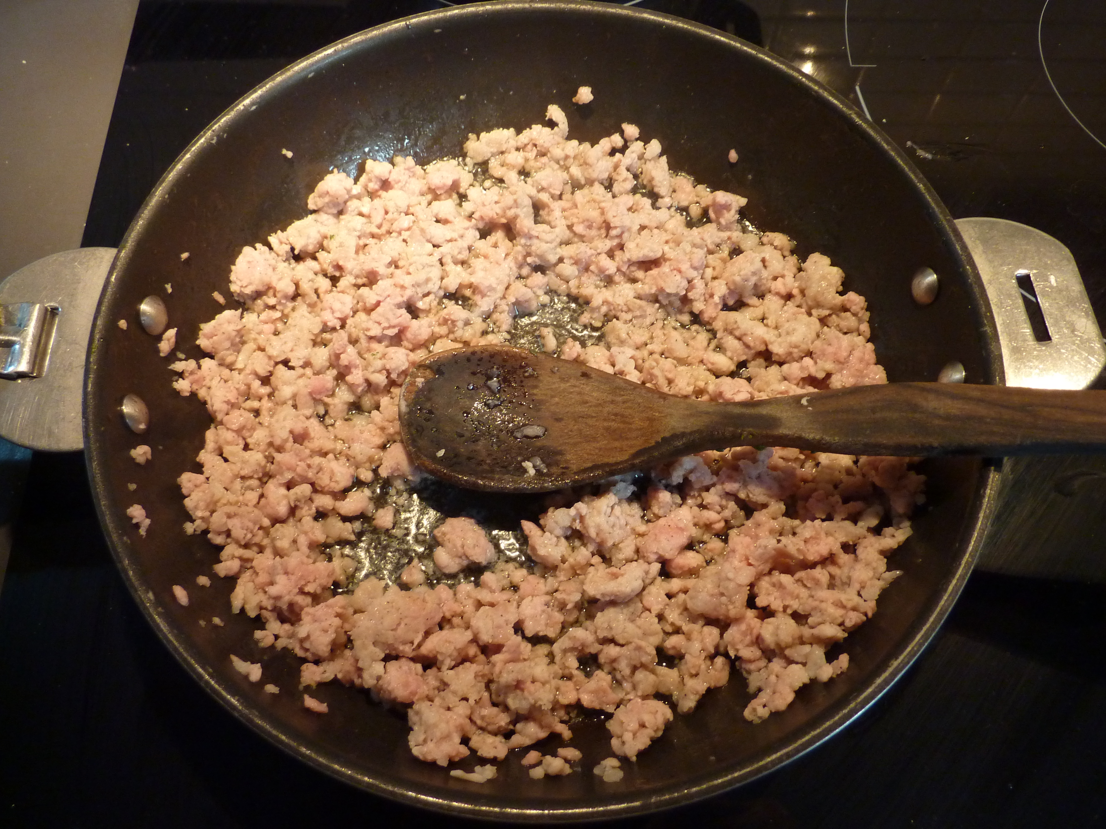 Dernier ingrédient pour la farce, la chair à saucisse, qu’il faut faire rissoler avec deux cuillères d’huile.