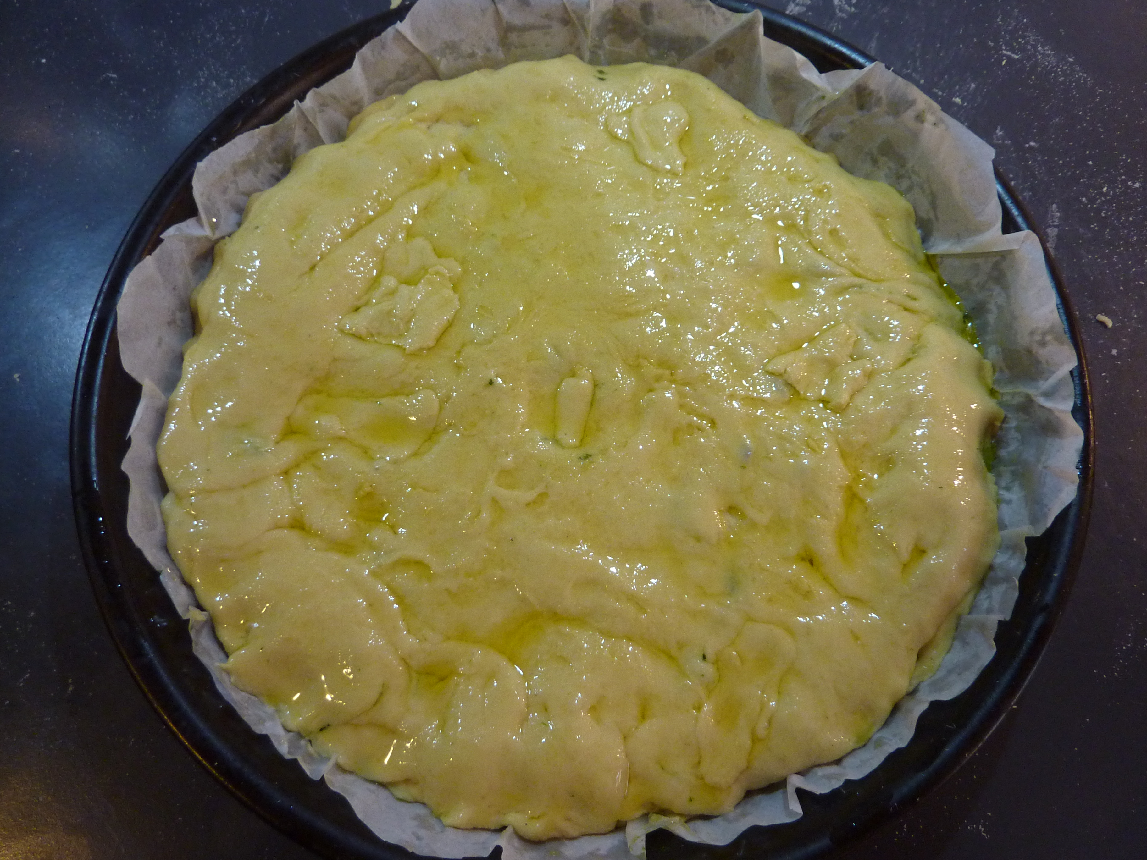 Scellons le tout avec la deuxième partie de la pâte, et versons un filet d’huile sur la surface, pour éviter qu’elle ne craque durant la cuisson. Allumons le four, et laissons cuire pendant quarante minutes à 220°C (ça dépendra de votre four).