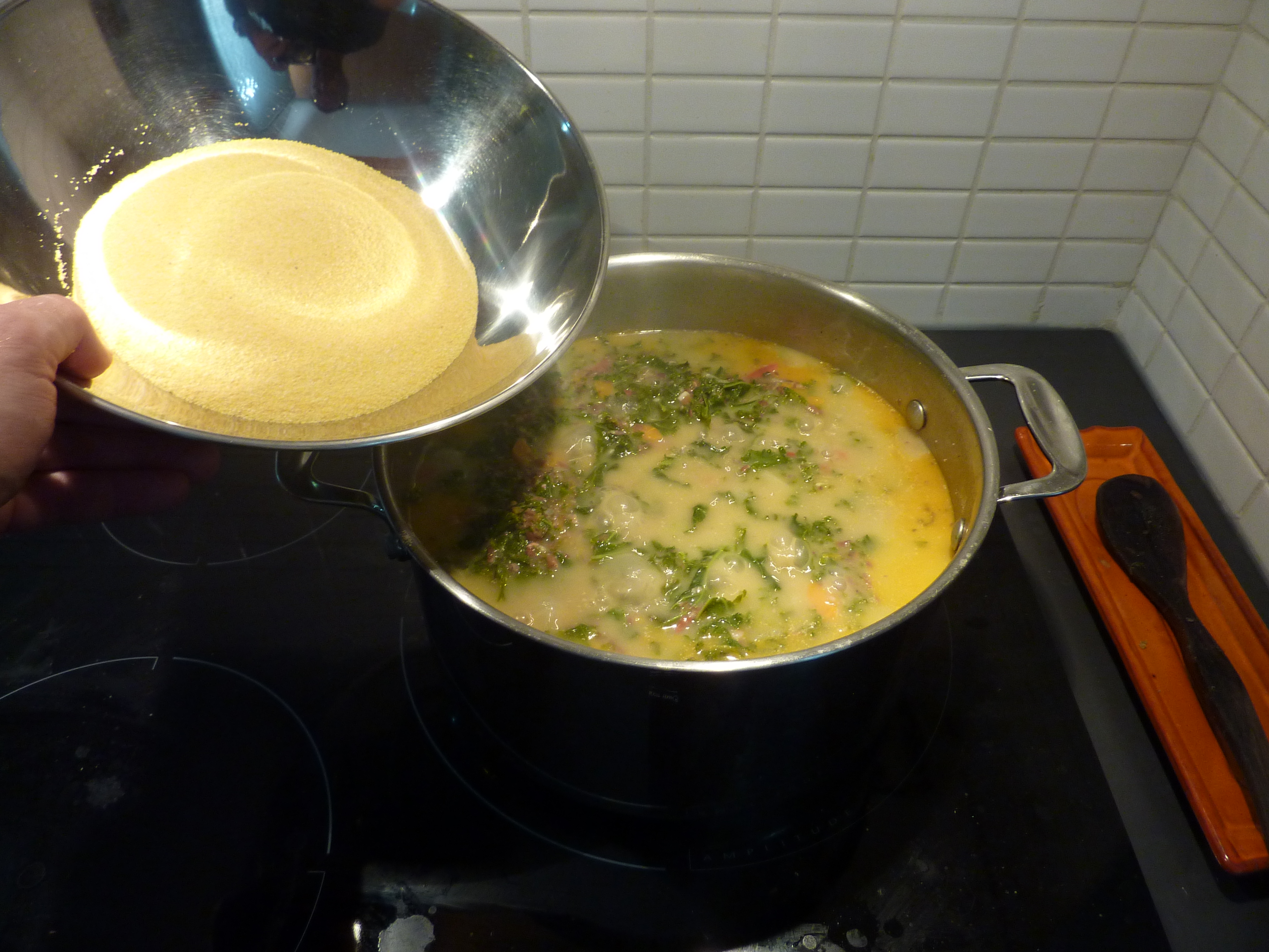 Et pour donner du corps, le dernier élément, la farine de maïs, est crucial. Touillez bien pour empêcher qu’elle ne solidifie trop rapidement : le bordatino au final c’est une espèce de polenta, un peu plus liquide.
