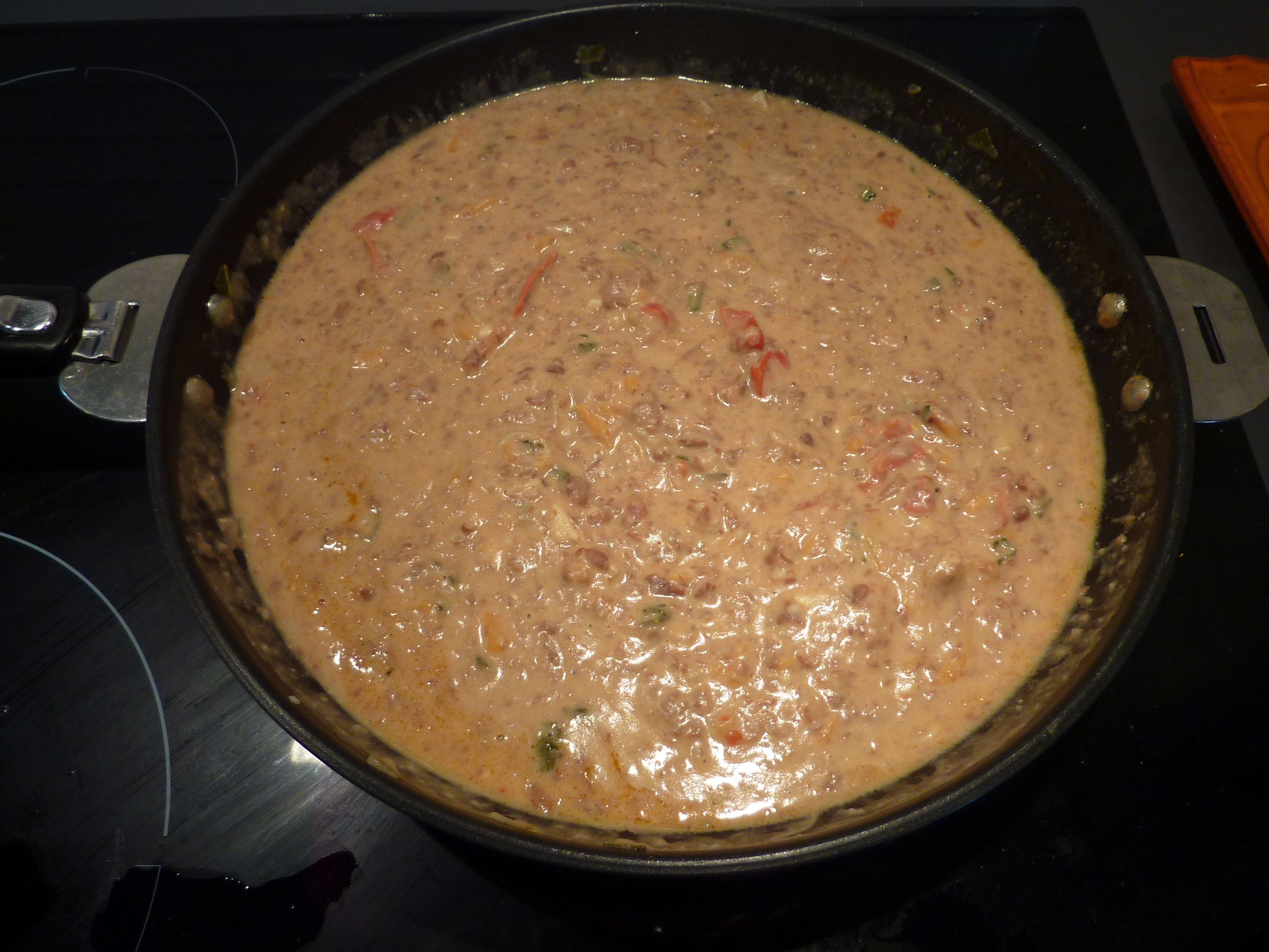 …et versez la crème de haricots. Continuez à touiller, à feu doux, et mettez une poignée de sel fin, du poivre, et un filet d’huile.