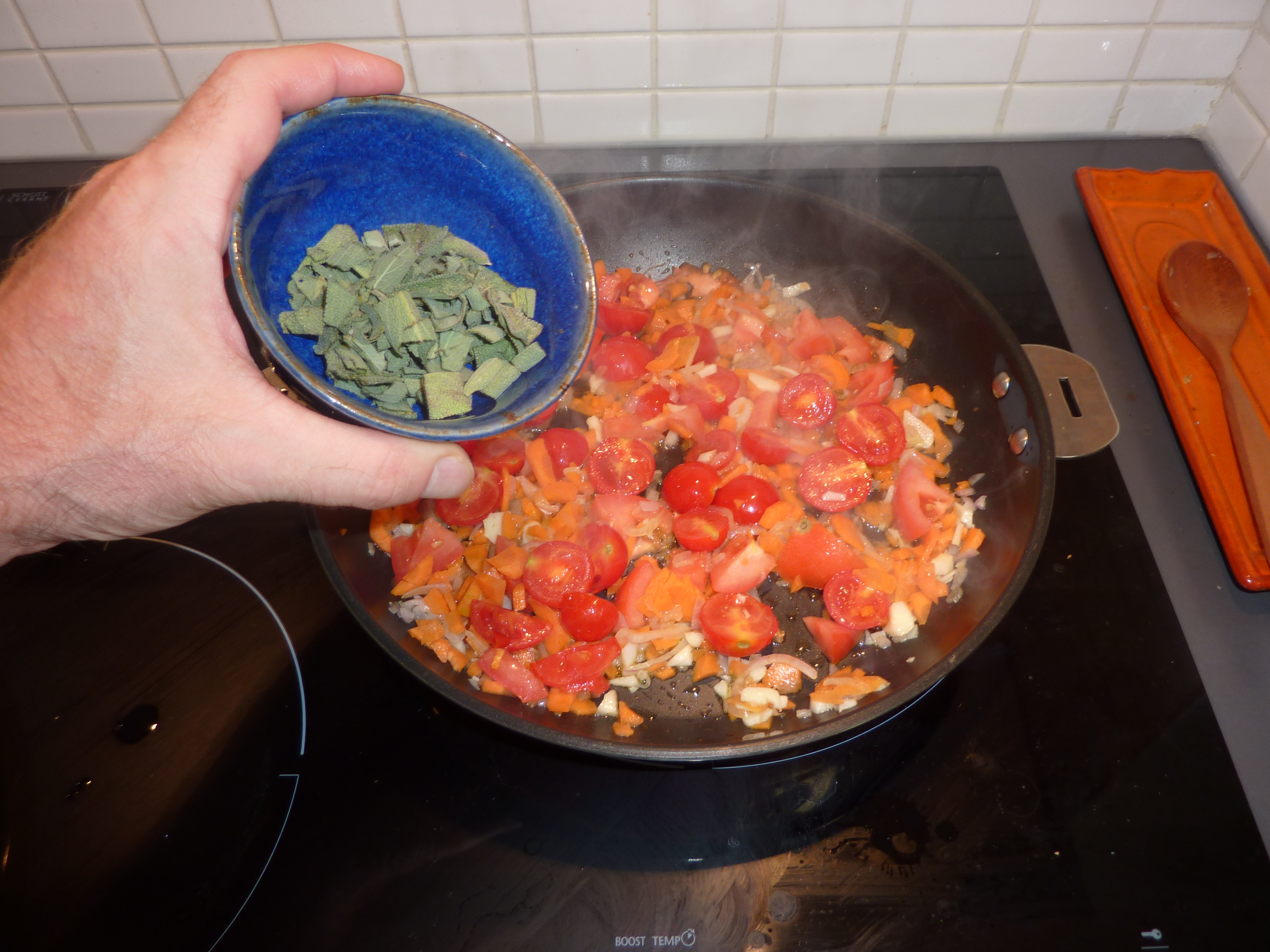 Faites frire dans l’huile ail, oignon et piment. Attendez qu’ils soient dorés, ajoutez carottes et tomates, touillez. Parsemez la sauge. Laissez mijoter…