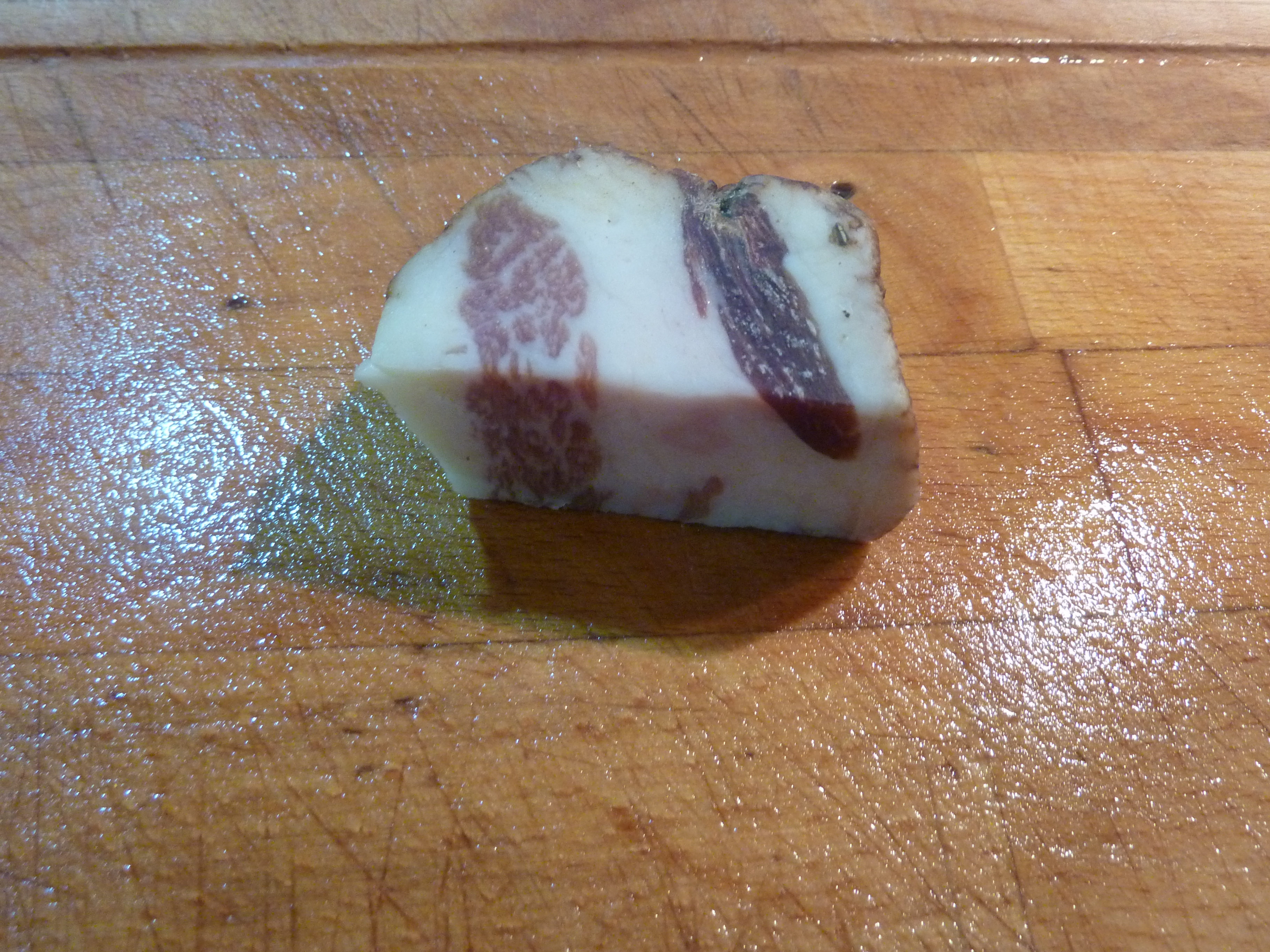 Pour donner du goût à la soupe, vous pouvez comme moi sortir un as de la manche : un bon morceau de guanciale (bas-joue) de porc, coupé en morceaux pour qu’il puisse fondre dans le chaudron…