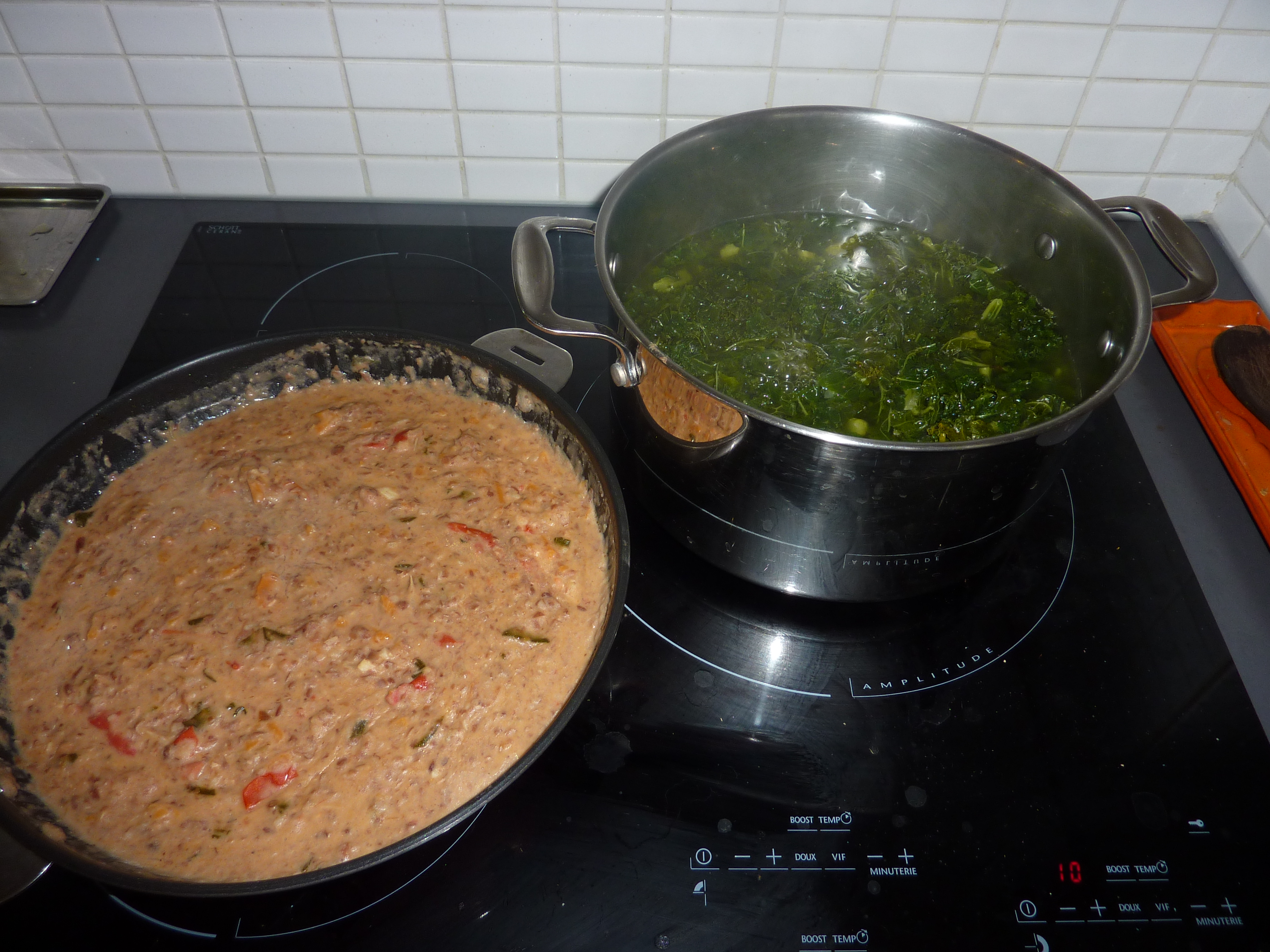 Achetés bio et secs, ils ont dû tremper dans un bol d’eau pendant une nuit. Le lendemain, je les ai fait bouillir deux bonnes heures avec un cube de bouillon végétal, avant de les égoutter et les passer au mixeur (avec un peu d’huile extra vierge d’olive). Afin d’obtenir une crème assez dense.Venons-en au chou. Il faut lui retirer la tige et le couper en morceaux, pour ensuite l’ébouillanter un bon moment. Vous verrez, il est coriace…