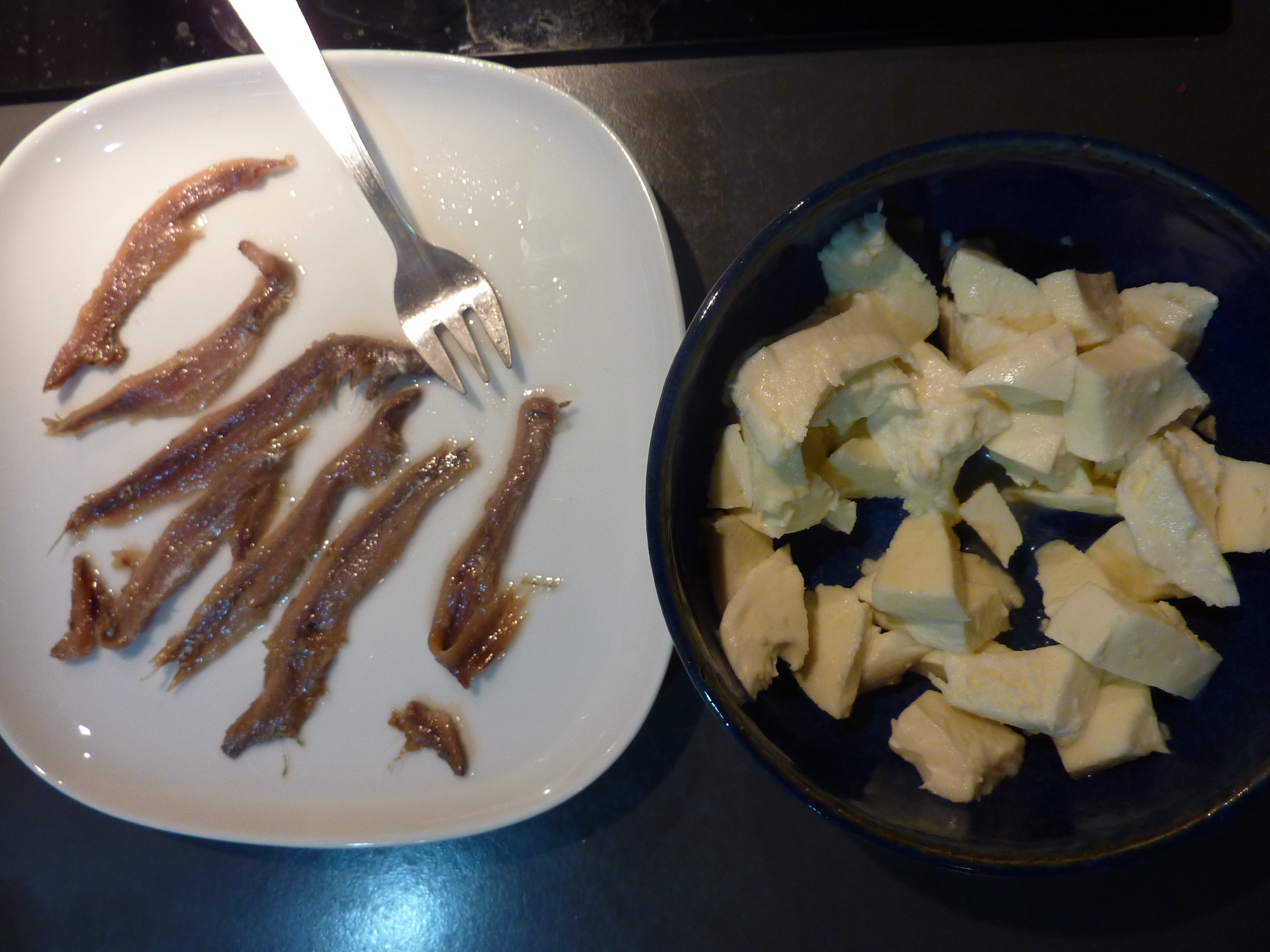 …et mettre de côté des mozzarelle coupées en petits morceaux et des filets d’anchois qui viendront exalter le goût de la fleur.