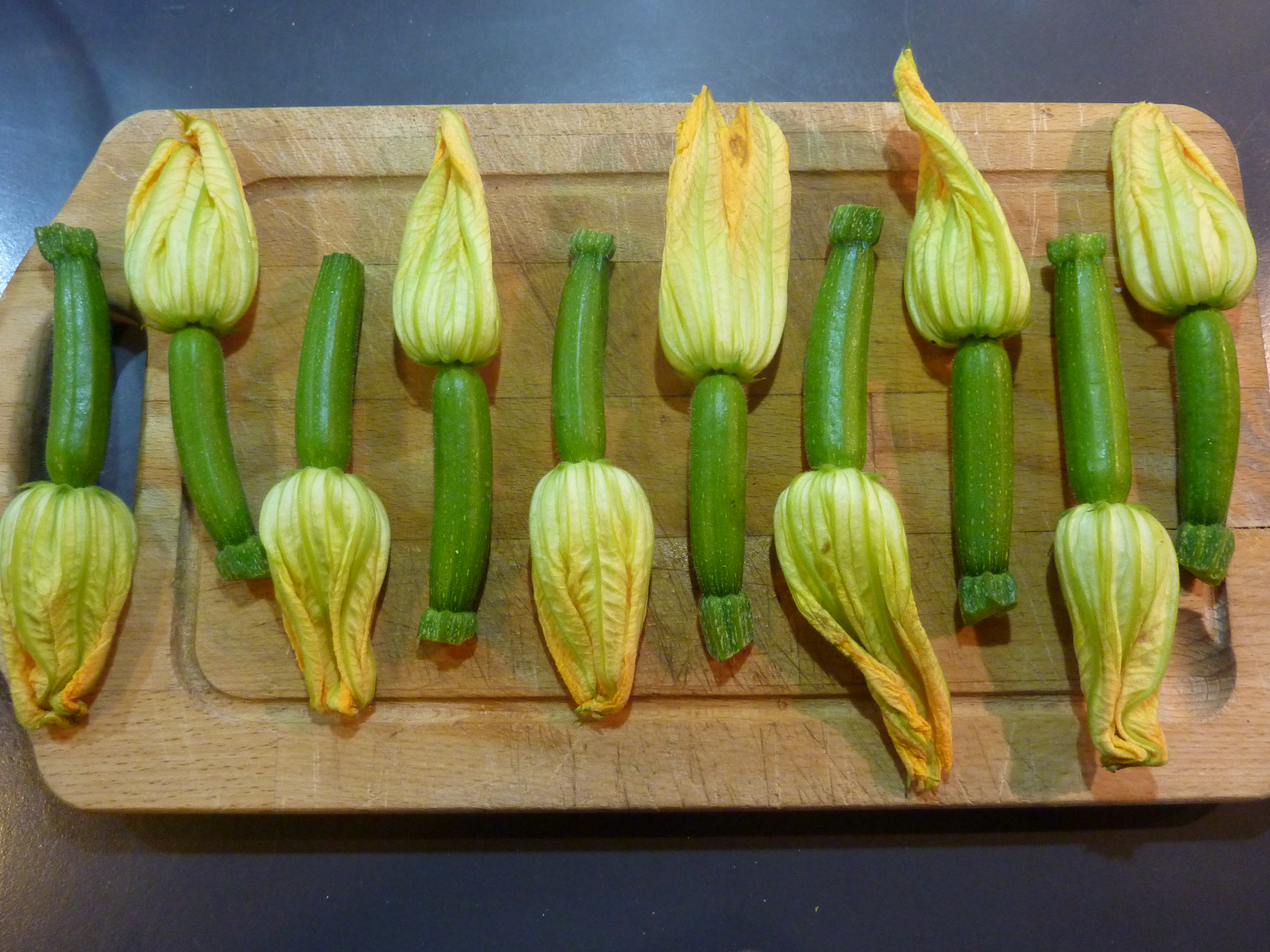 Les fleurs de courgettes sont délicieuses mais on en trouve peu sur les marchés car elles sont si délicates qu’elles ne souffrent quasi aucun transport. Il existe, en vérité, deux types : les masculins et les féminins. Les premiers s’ouvrent au sommet d’un long pédoncule qui a le même diamètre du début à la fin, alors que les secondes se trouvent au sommet d’un petit appendice qui ressemble à une minuscule courgette. Les fleurs masculines sont mieux adaptées aux beignets… mais je n’ai trouvé que des féminines.