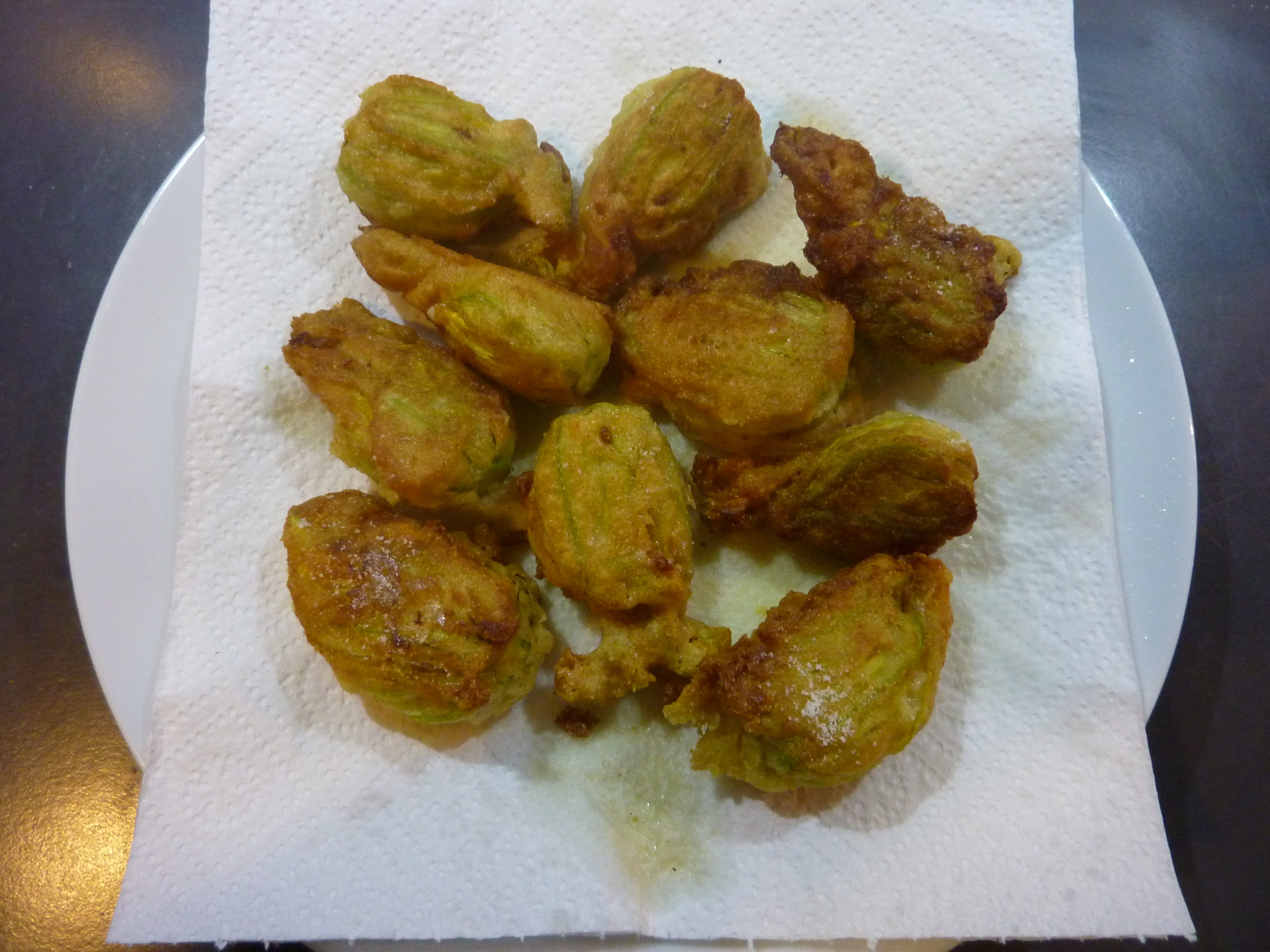 Ingredients : 12 fleurs de courgettes; 100 gr. de farine de blé dur, six anchois; 1 mozzarella; 1 bière; 1 œuf; huile de colza, sel
