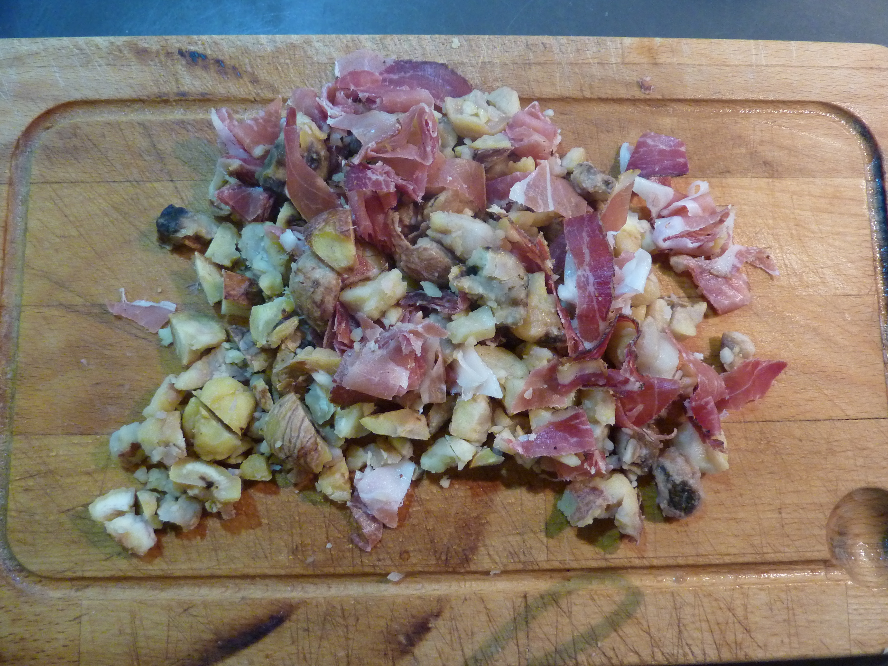 Le châtaigner se serait développé après l’ère glaciale, en Asie, comme en Europe et en Amérique. Ses origines restent floues. En tout cas, il pousse sous un climat tempéré et aime les étés pluvieux. Quand les conditions sont optimales, comme en Vallée d’Aoste, il peut vivre plusieurs siècles. Á l’époque romaine, on en trouvait non seulement dans le nord de la péninsule, mais aussi dans le Sud profond. Pline l’Ancien (Nat. Hist., Botanique, XV, 93-94); cite une variété de châtaignes très prisées, qui venaient des alentours de Tarente, dans les Pouilles. Pas vraiment une région humide, aujourd’hui. La recette que j’ai sélectionnée aujourd’hui vient de l’arc alpin. Et elle associe un ingrédient qui est caractéristique de cette région, aux confins avec l’Autriche, le speck du Trentino-Alto Adige (jambon fumé en français). Je sais, on est en Italie, mais on parle allemand. Que voulez vous; c’est le poids de l’histoire…