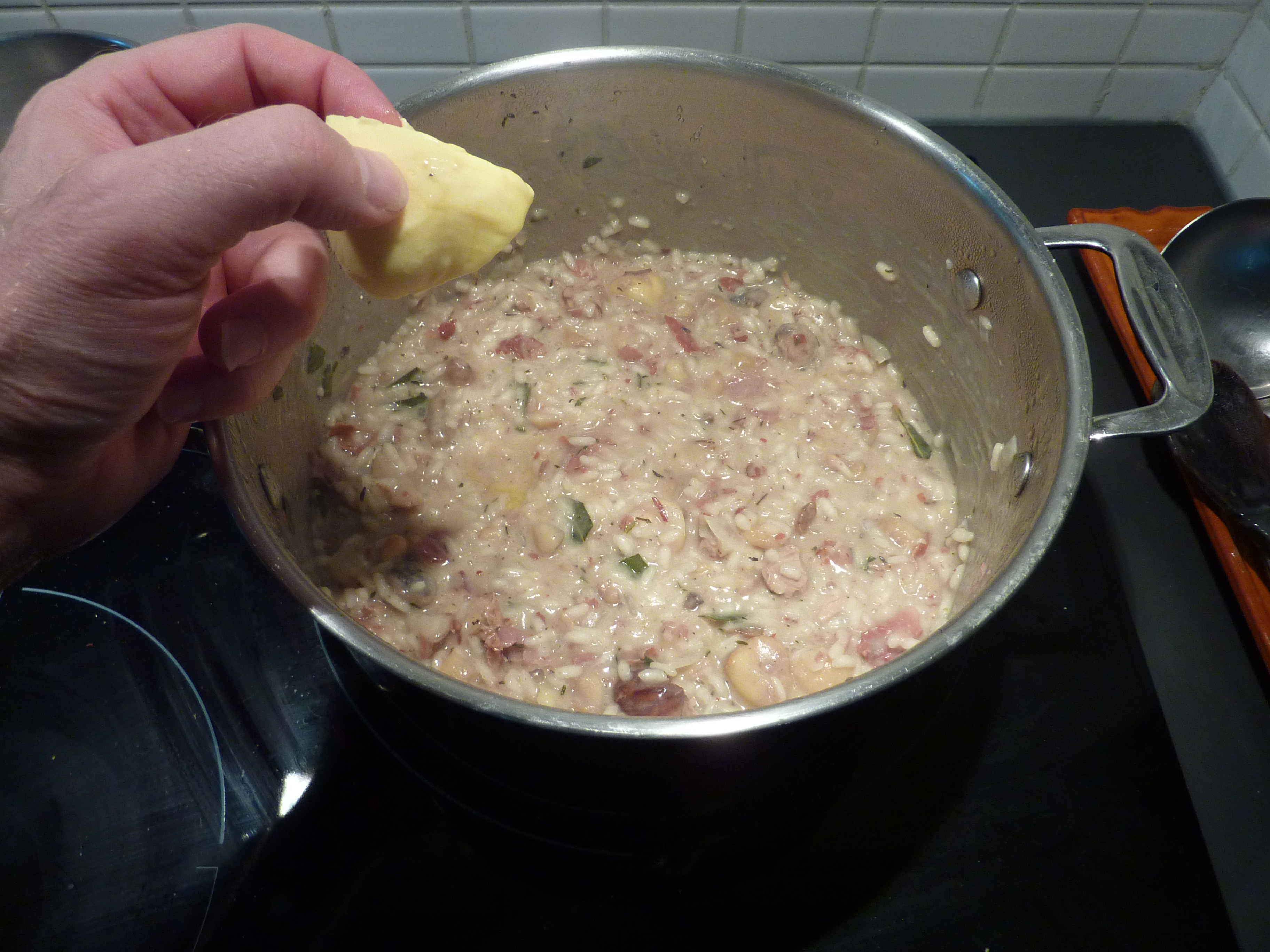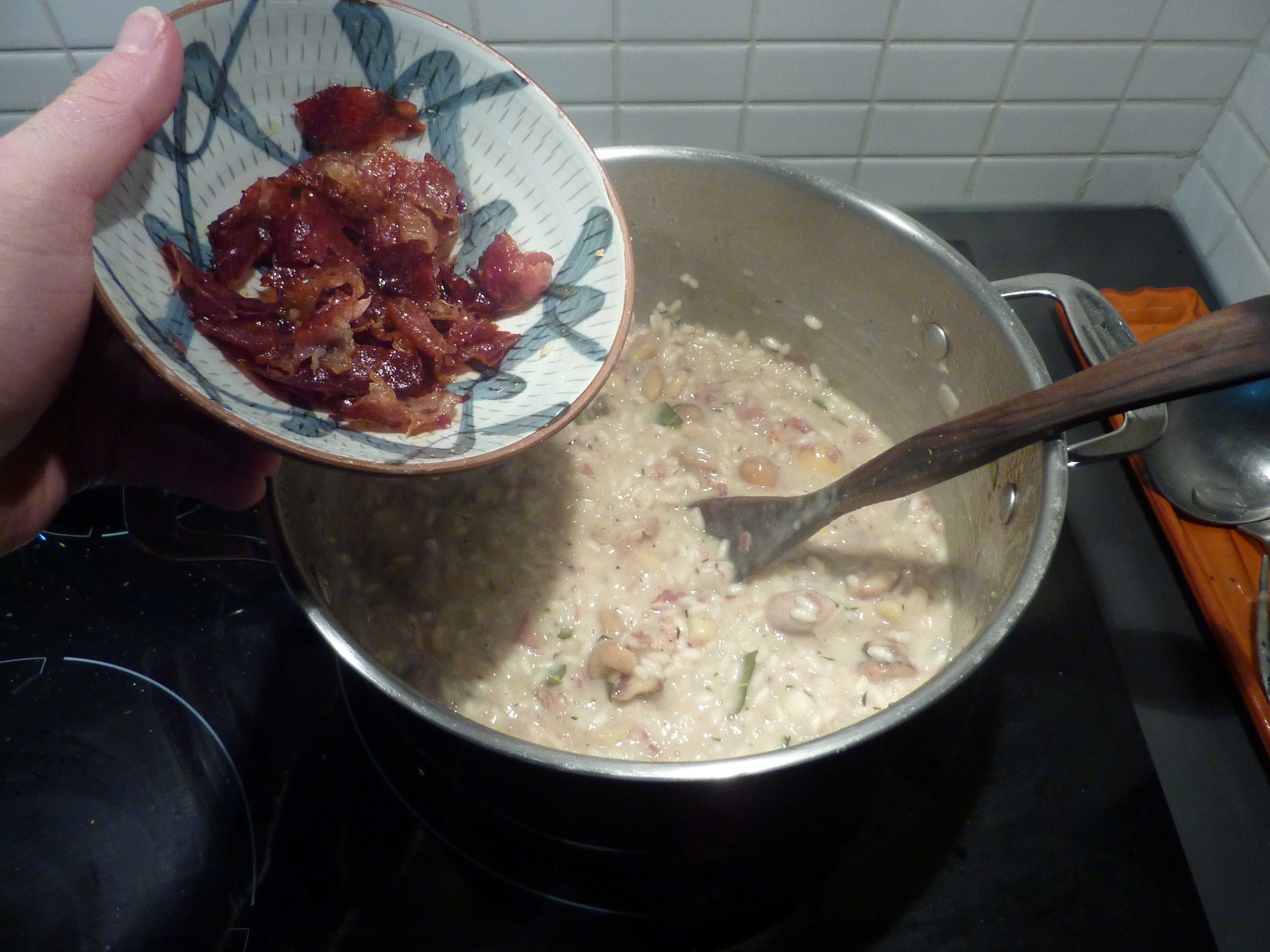 Vers la fin de la cuisson du riz, ajoutez le reste du speck, coupé en morceaux.