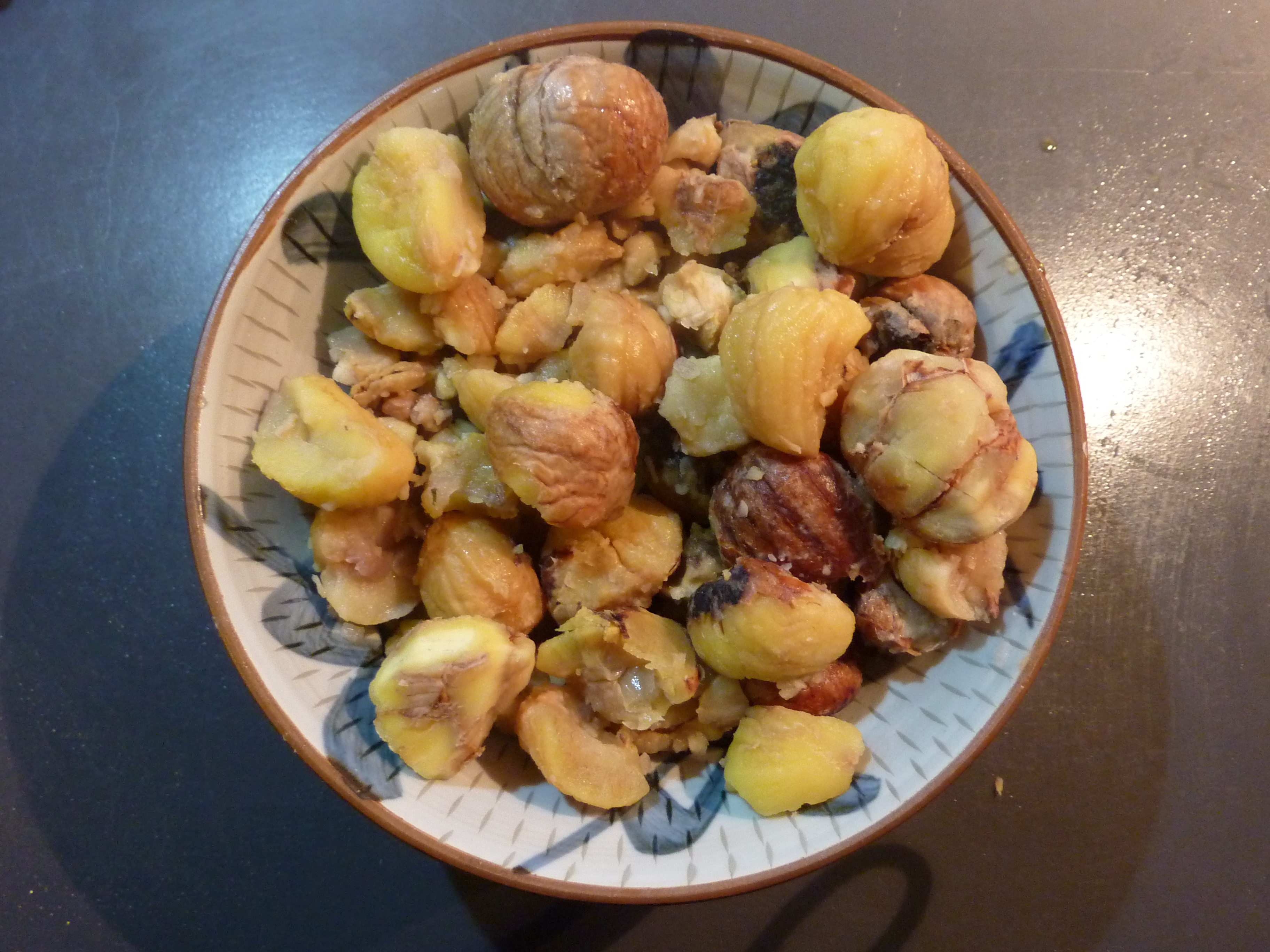 Nettoyez ensuite les châtaignes sous l’eau courante, pour les débarrasser de l’écorce et de la petite peau. Bien entendu, cela fait mal aux mains…