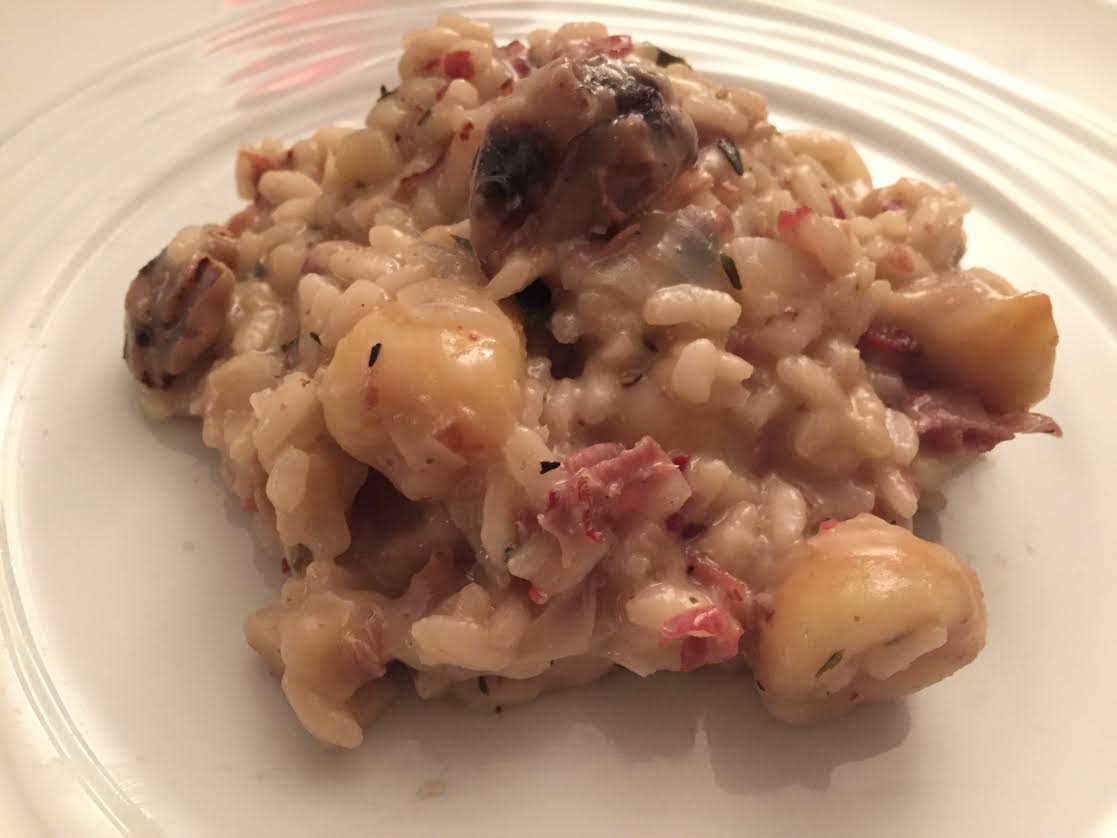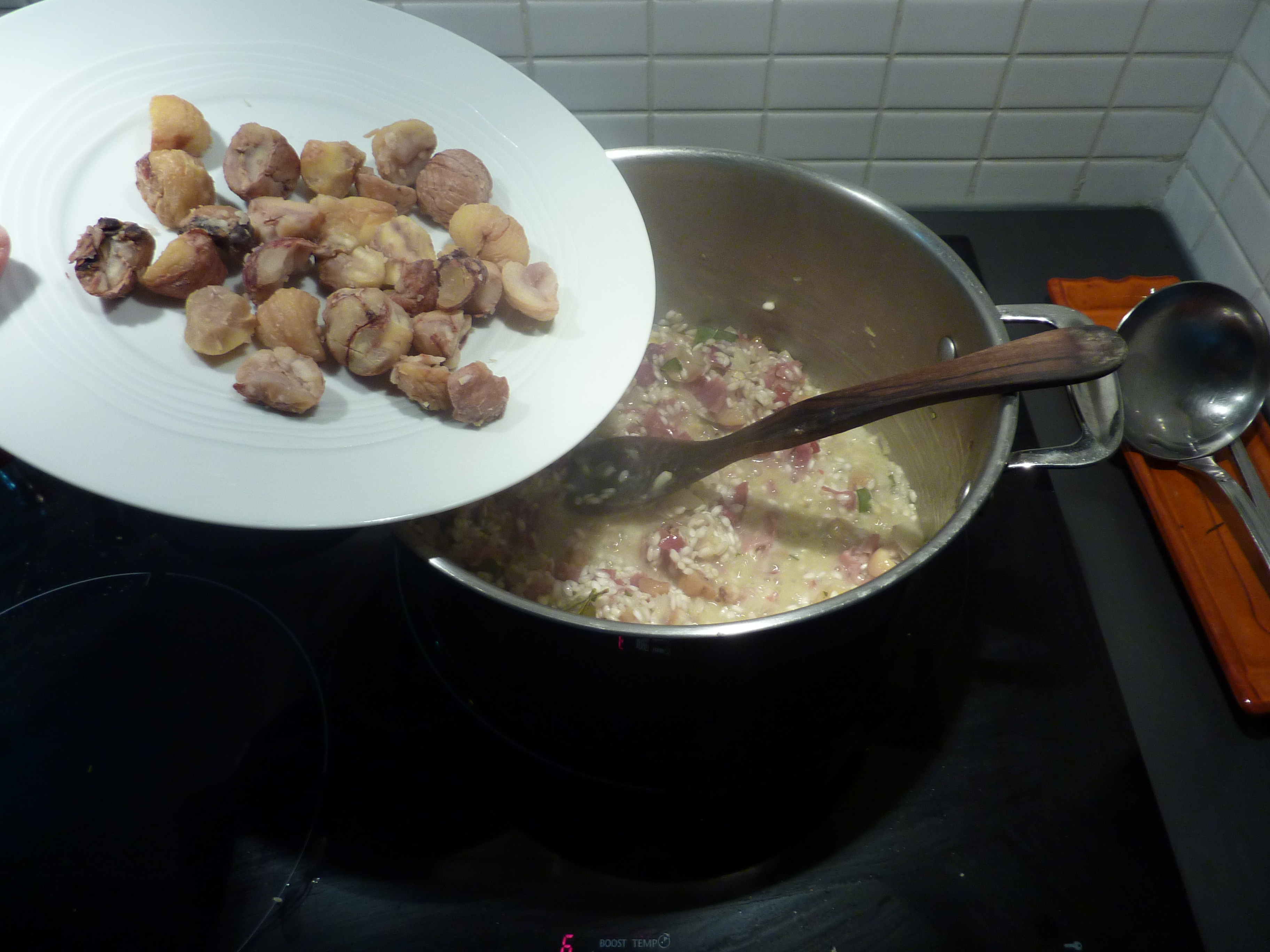 Pour se croire en pleine nature, entre une randonnée et une descente à ski, parlons de ce risotto automnal…en commençant par les châtaignes. Elles devront être incises d’un bord à l’autre de la lunule (partie claire de l’écorce), en passant par la pointe. Après quoi, il faudra les faire bouillir dans de l’eau aromatisée avec de feuilles de laurier, pendant au moins une trentaine de minutes. En ajoutant aussi une cuillère à soupe d’huile d’olive, pour adoucir l’écorce.