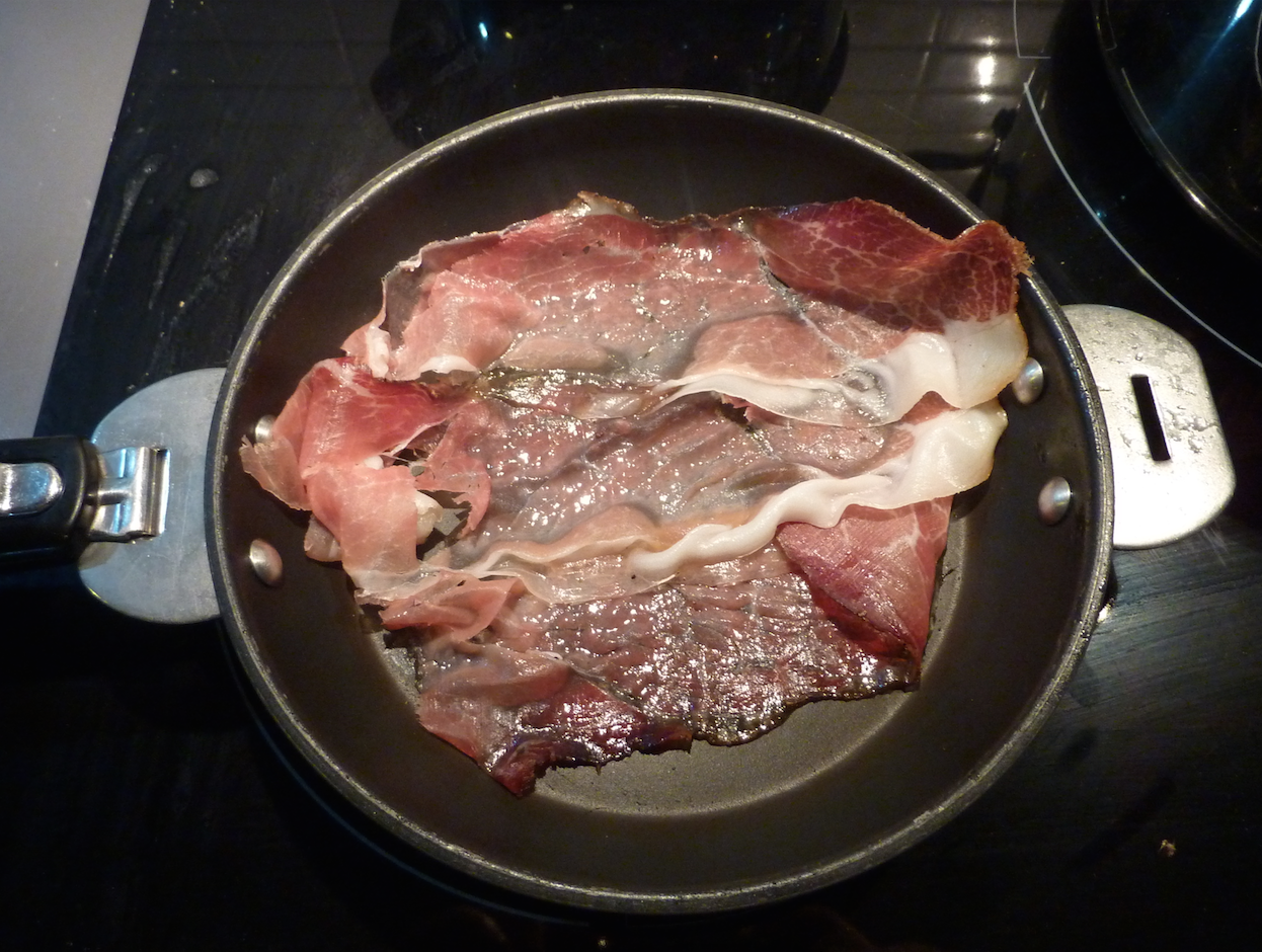 En ce qui concerne le speck, il faut en découper une moitié en petits morceaux, et garder l’autre pour plus tard.