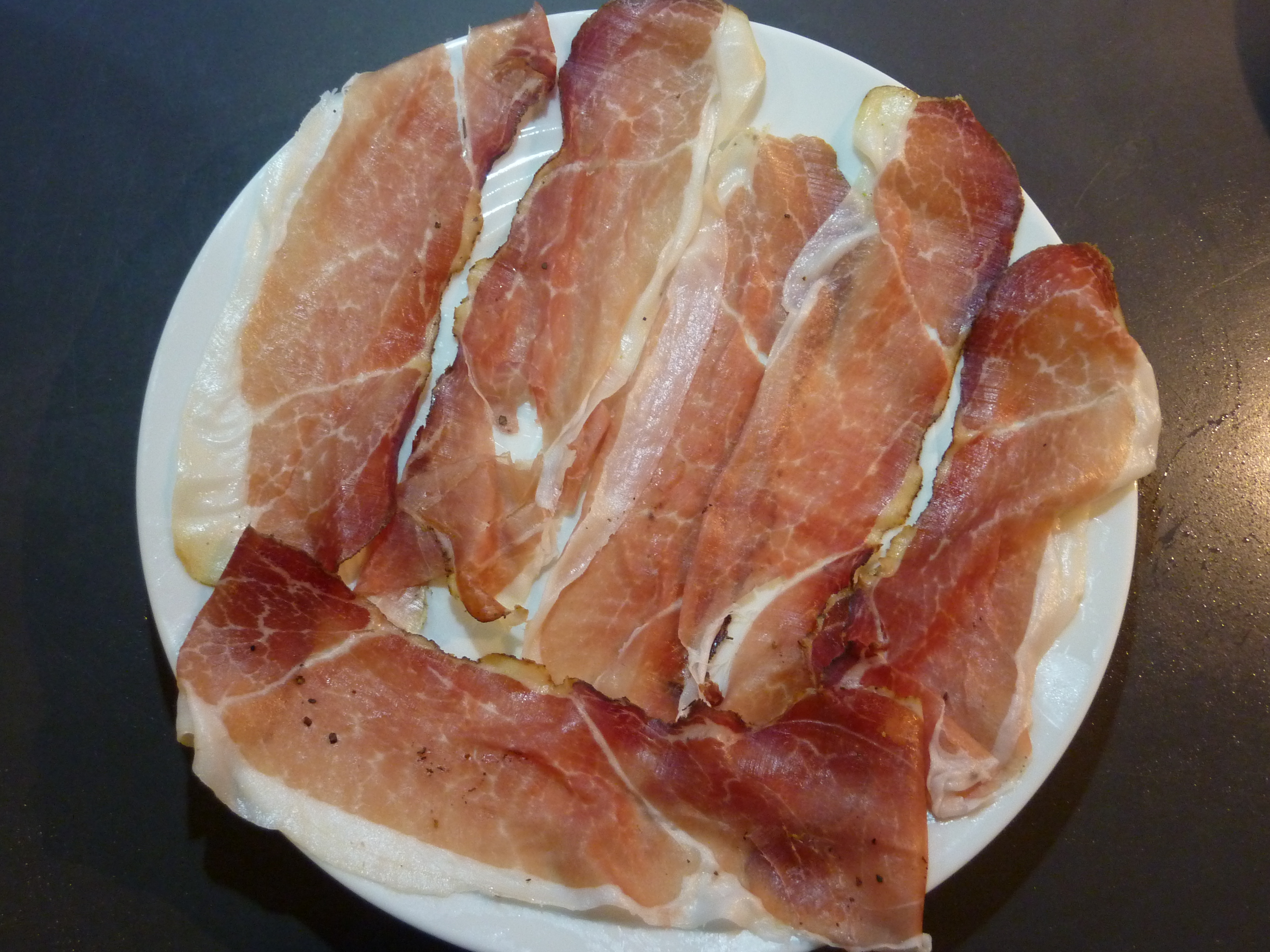 C’est un produit traditionnel depuis le Moyen Age, qui permettait autrefois aux gens des montagnes de conserver la seule viande (de porc)qu’ils arrivaient à se mettre sous la dent. C’est aussi un produit au croisement de deux mondes : le méditerranéen (la viande est soumise à l’affinage -minimum 22 semaines-; et au salage – 5%-), et nord-européen (la viande est aussi fumée).