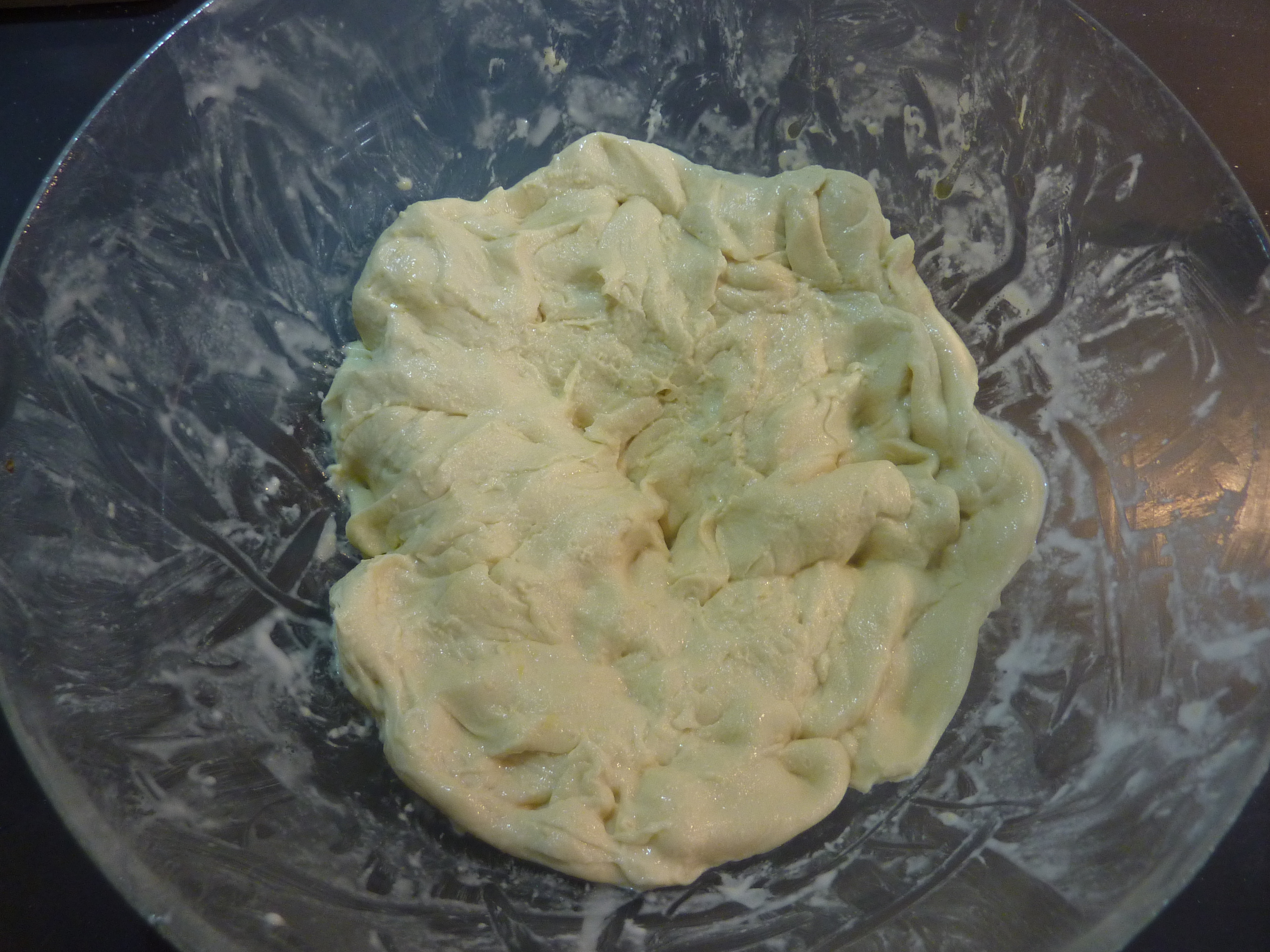 Le résultat, après avoir pétri à la main pendant un bon moment, devra être très fluide, et un peu aqueux. Couvrez le tout avec un chiffon humide, et laissez reposer deux heures minimum, à l’abri.