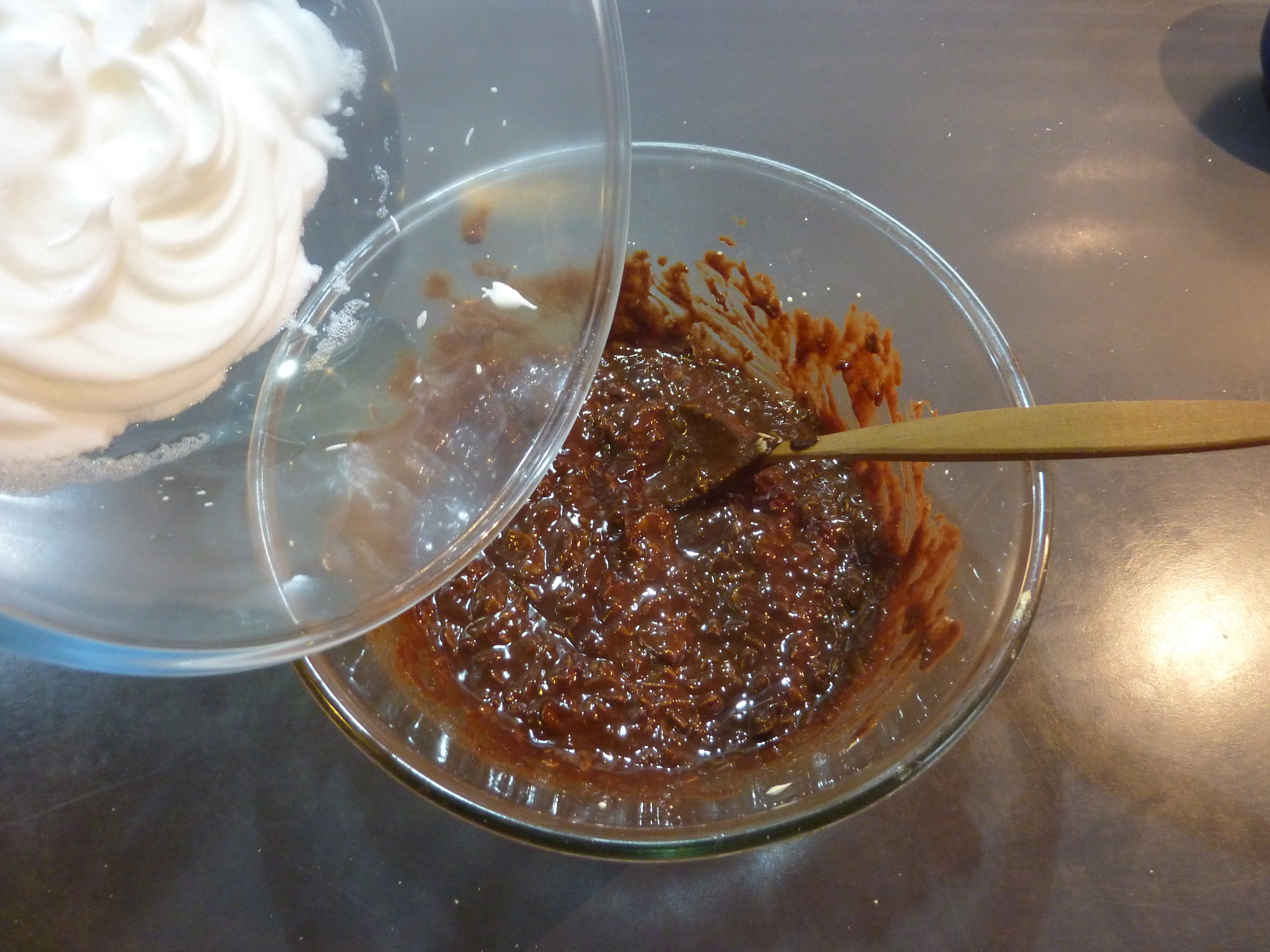 Commençons donc à mélanger les ingrédients dans un bol. En premier, la mousse des jaunes d’oeufs, puis le chocolat/beurre. Touillez du bas vers le haut avec une cuillère en bois.