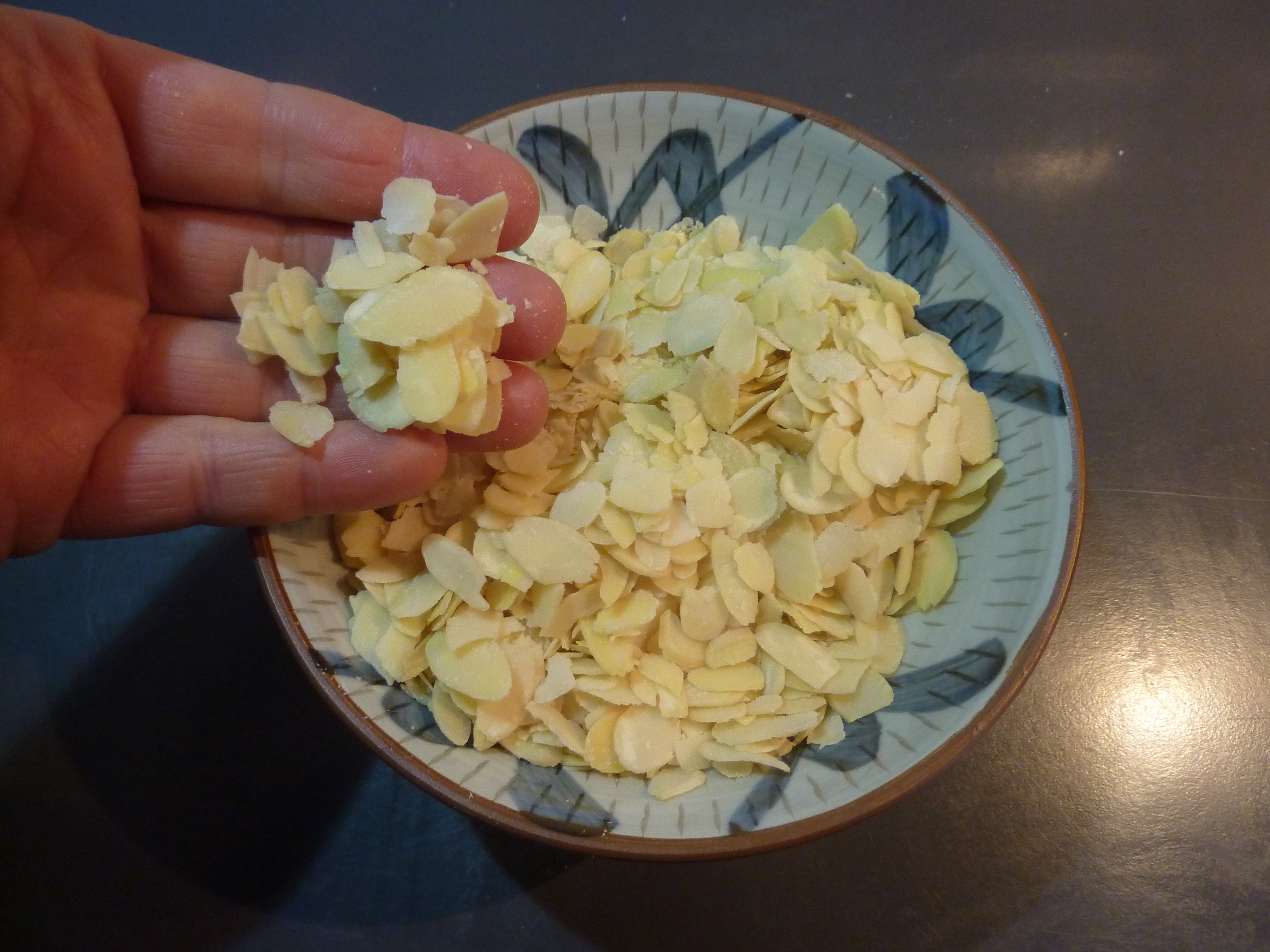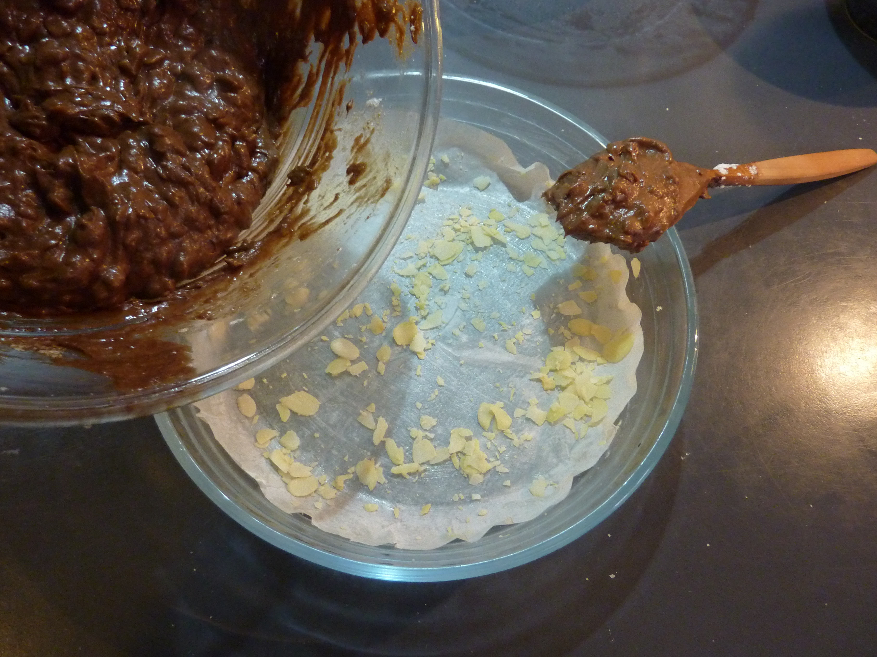 Pour finir, mettez quelques amandes sur le fond du plat à four, avant d’y couler le mélange qui est dans le bol.