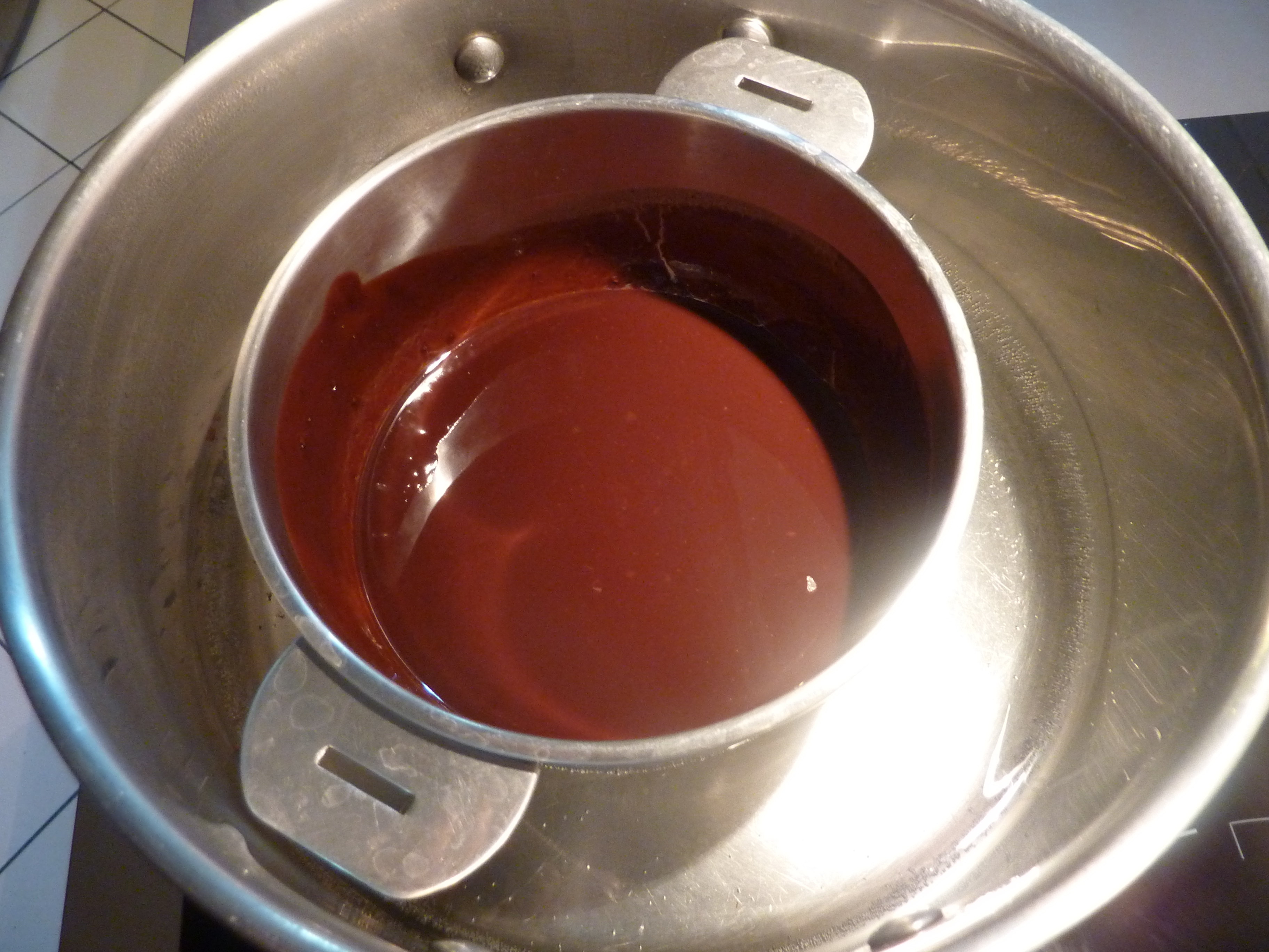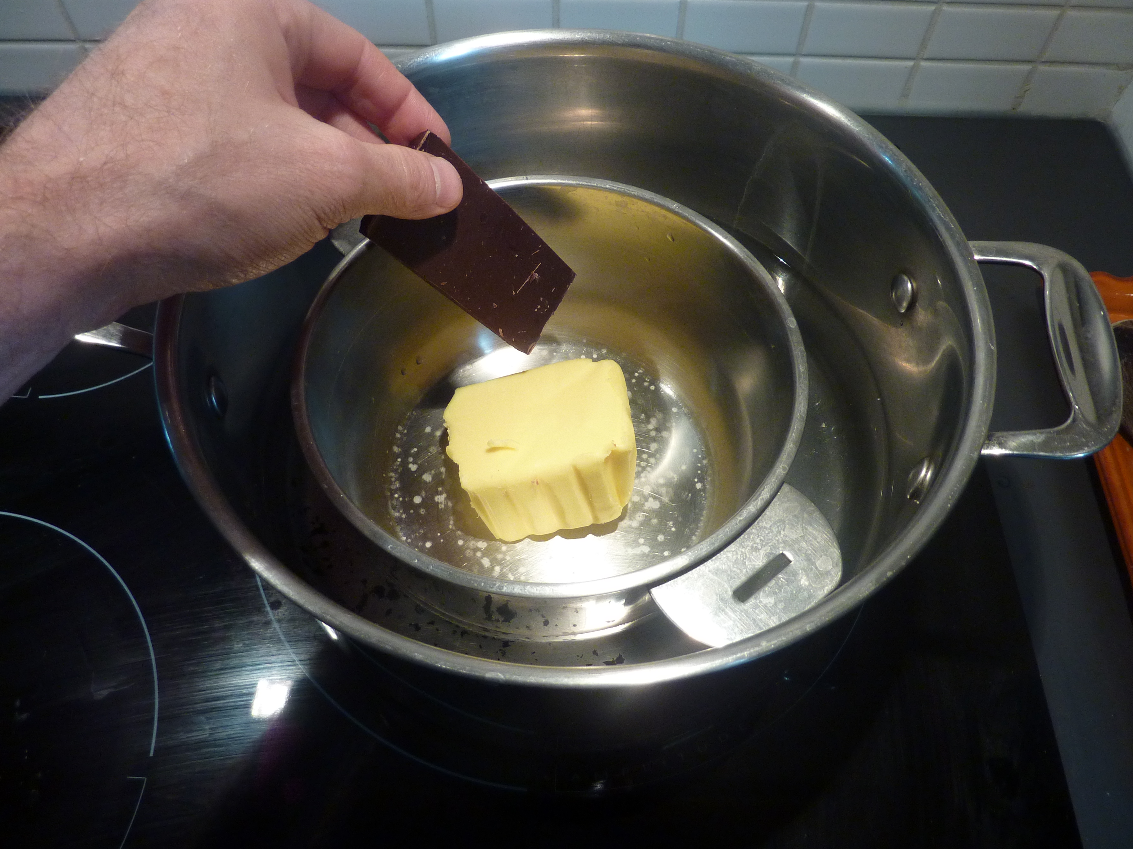 Première étape : faire fondre doucement au bain marie le beurre et le chocolat dans une casserole.