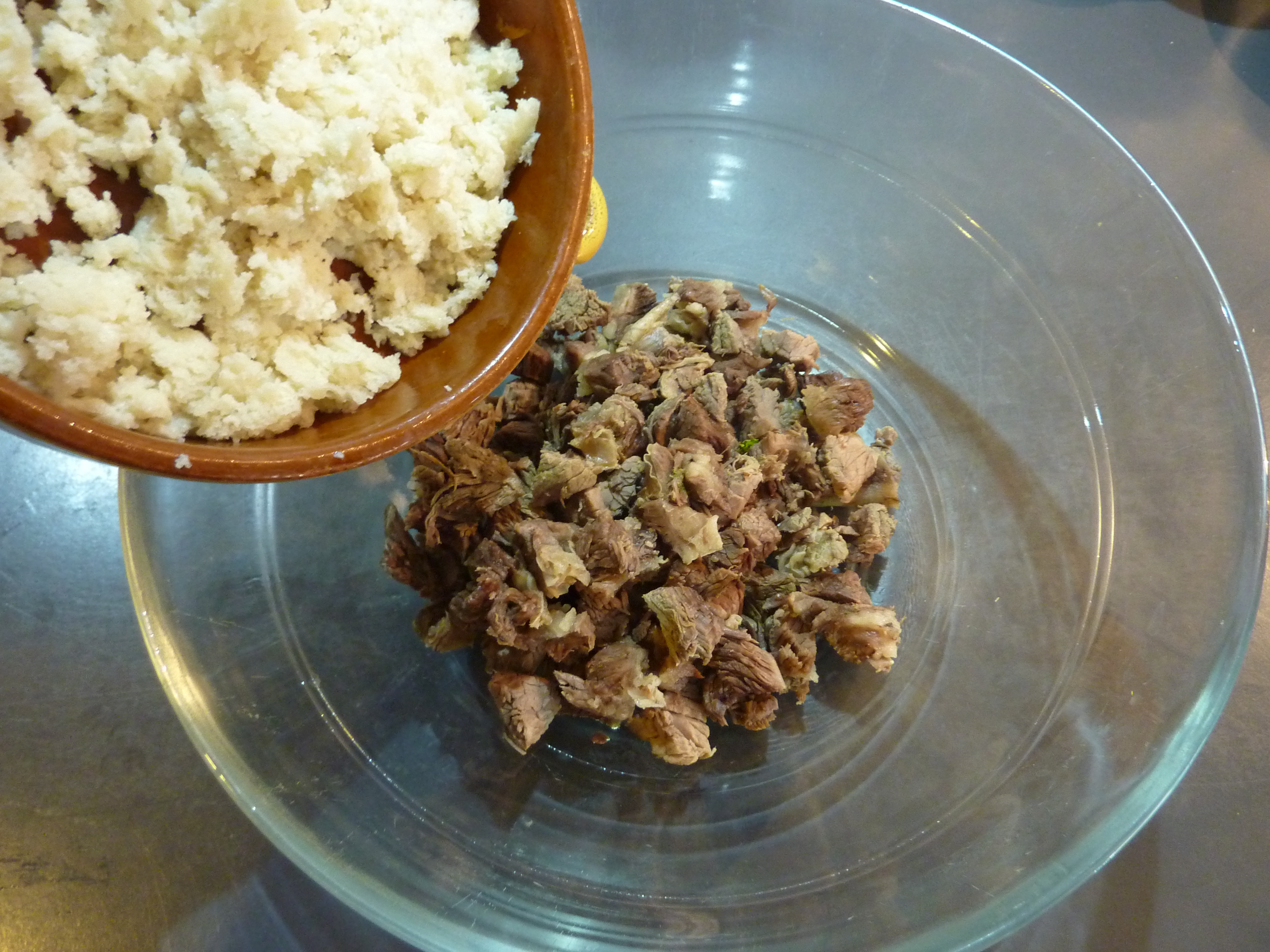Reprenons la recette : la viande déjà dans le bol, il faut y ajouter la mie de pain au lait…