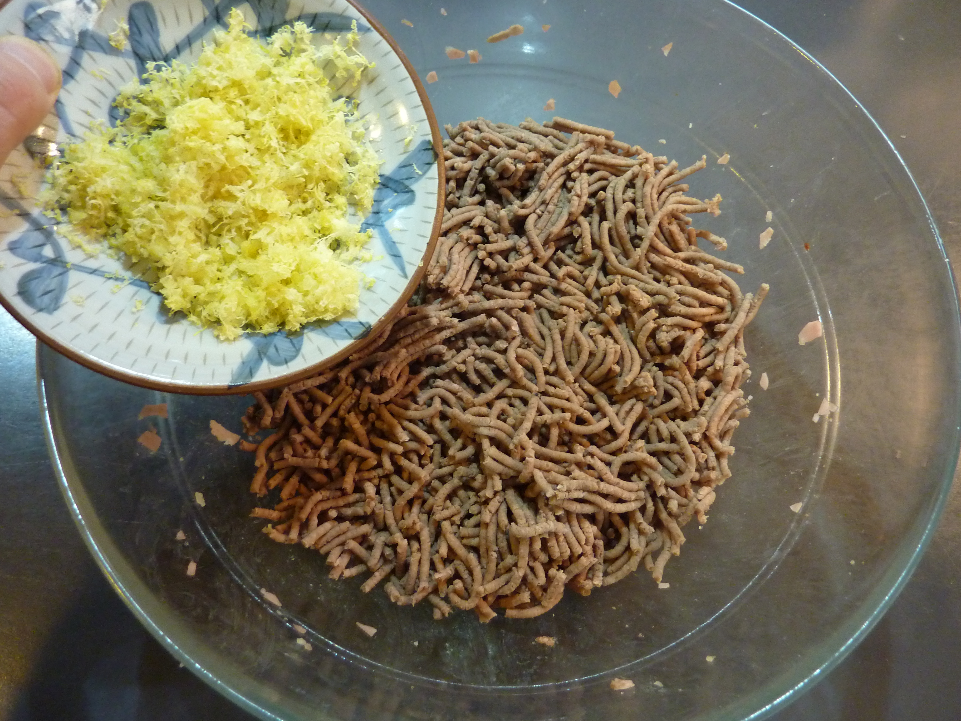 Á présent, c’est le tour de l’écorce de citron râpé de finir dans le bol…