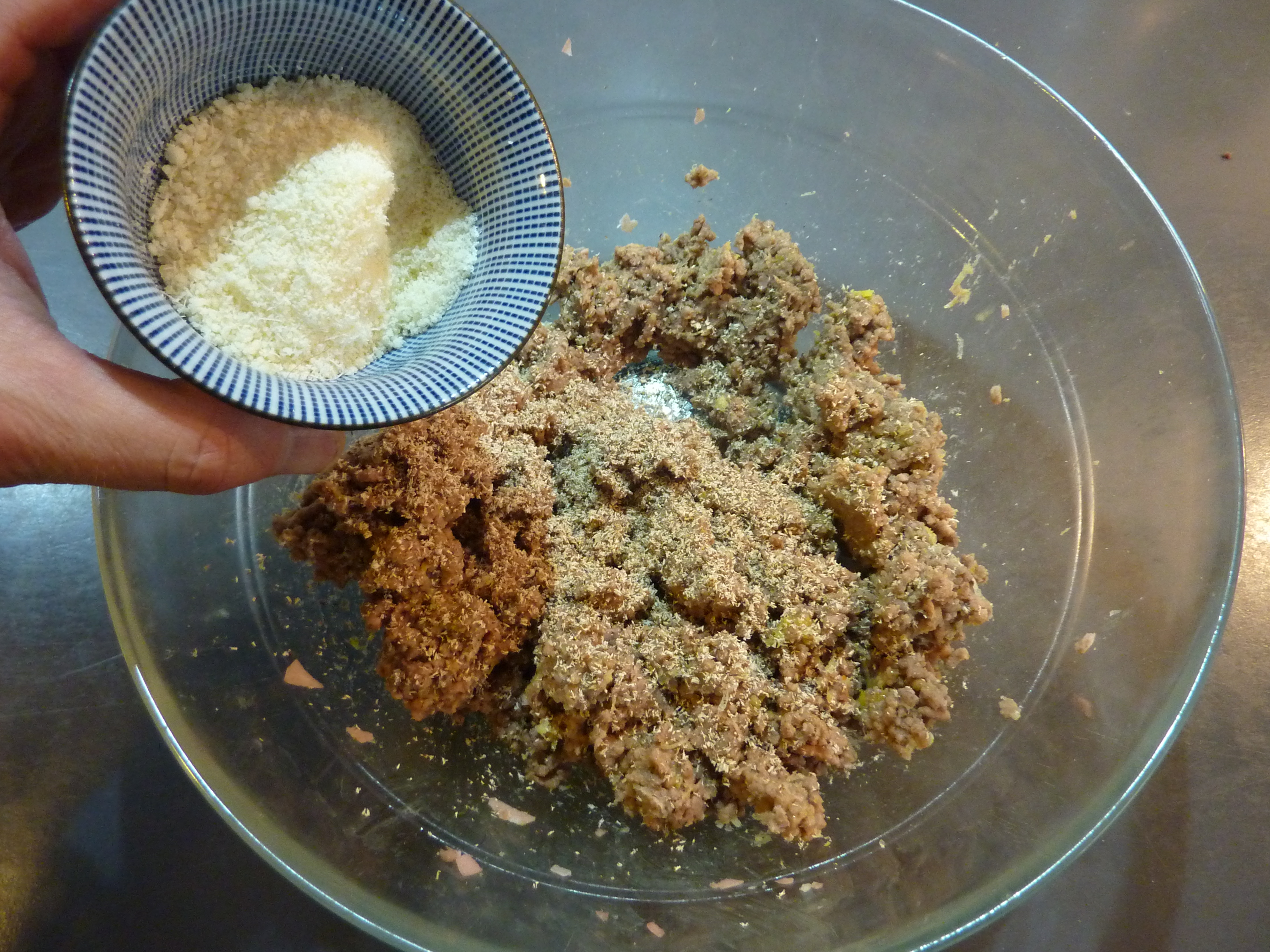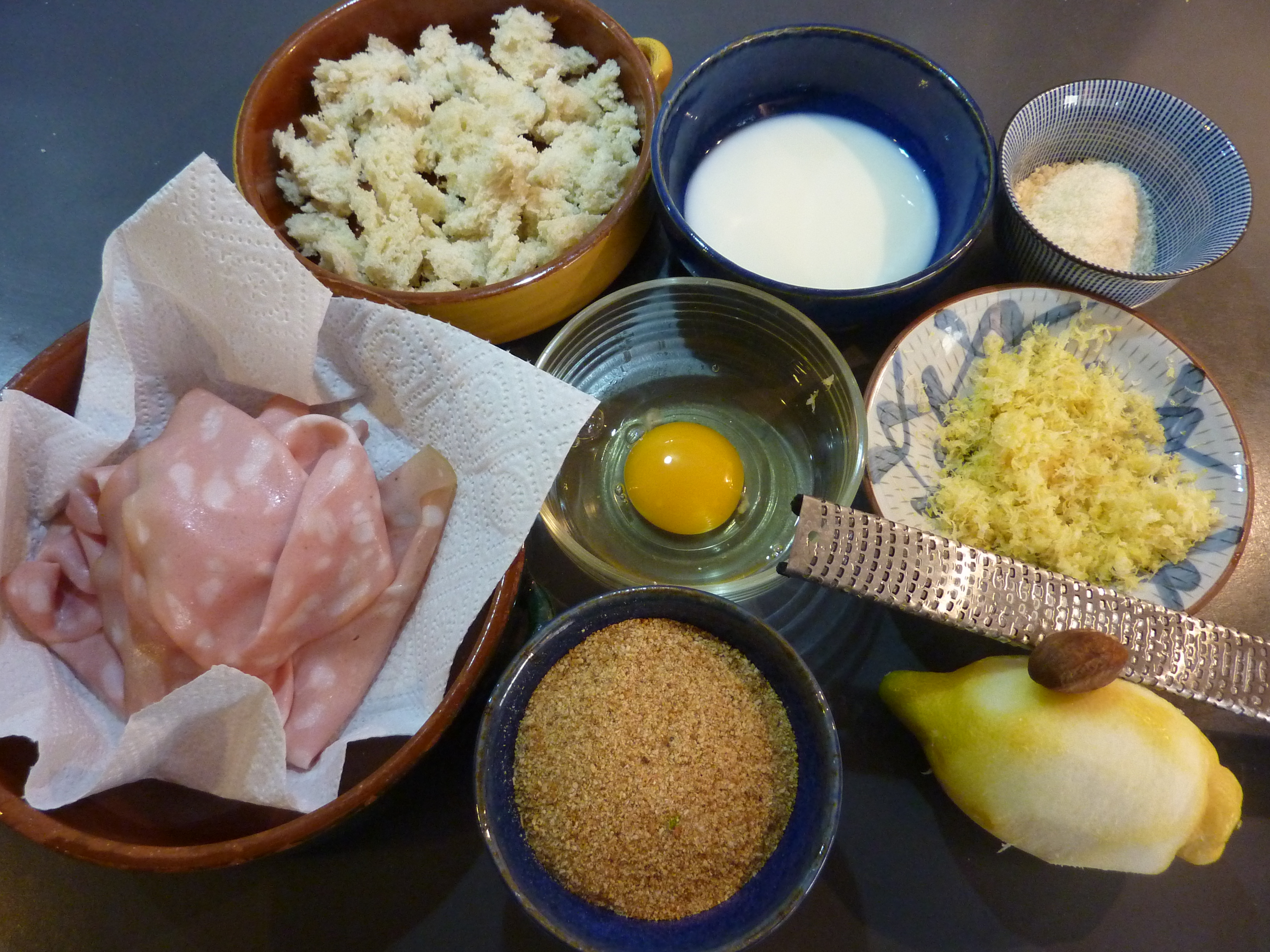 On aura largement le temps pour préparer le reste de la recette. A savoir de la mie de pain trempée dans du lait, de la chapelure, du fromage Grana padano et l’écorce d’un citron (bio), un oeuf, de la mortadella de porc (voire de la saucisse de foie), et de la noix de muscade. Une épice rare, au XVIIe siècle, si chère qu’on la estimait aussi précieuse que l’or.