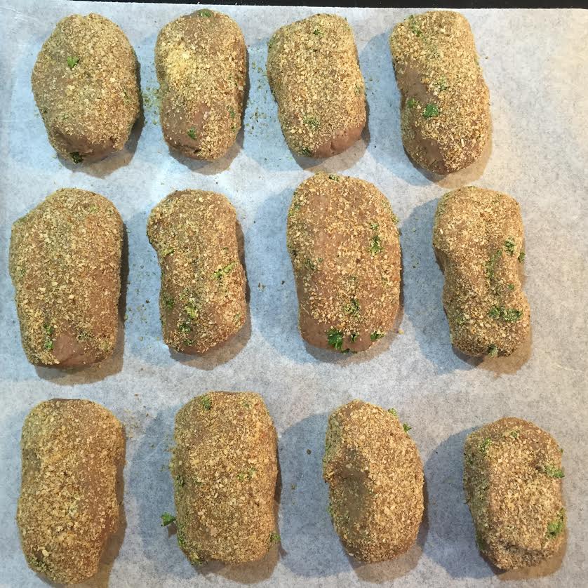 …avant de passer à la phase suivante : la création des mondeghili, à la main, un par un. En fait, à différence des paupiettes traditionnelles, elle sont légèrement aplatie et rectangulaires, d’un poids d’environ 35 gr. chacune. Toutes devrons être panées des deux côtés dans la chapelure…
