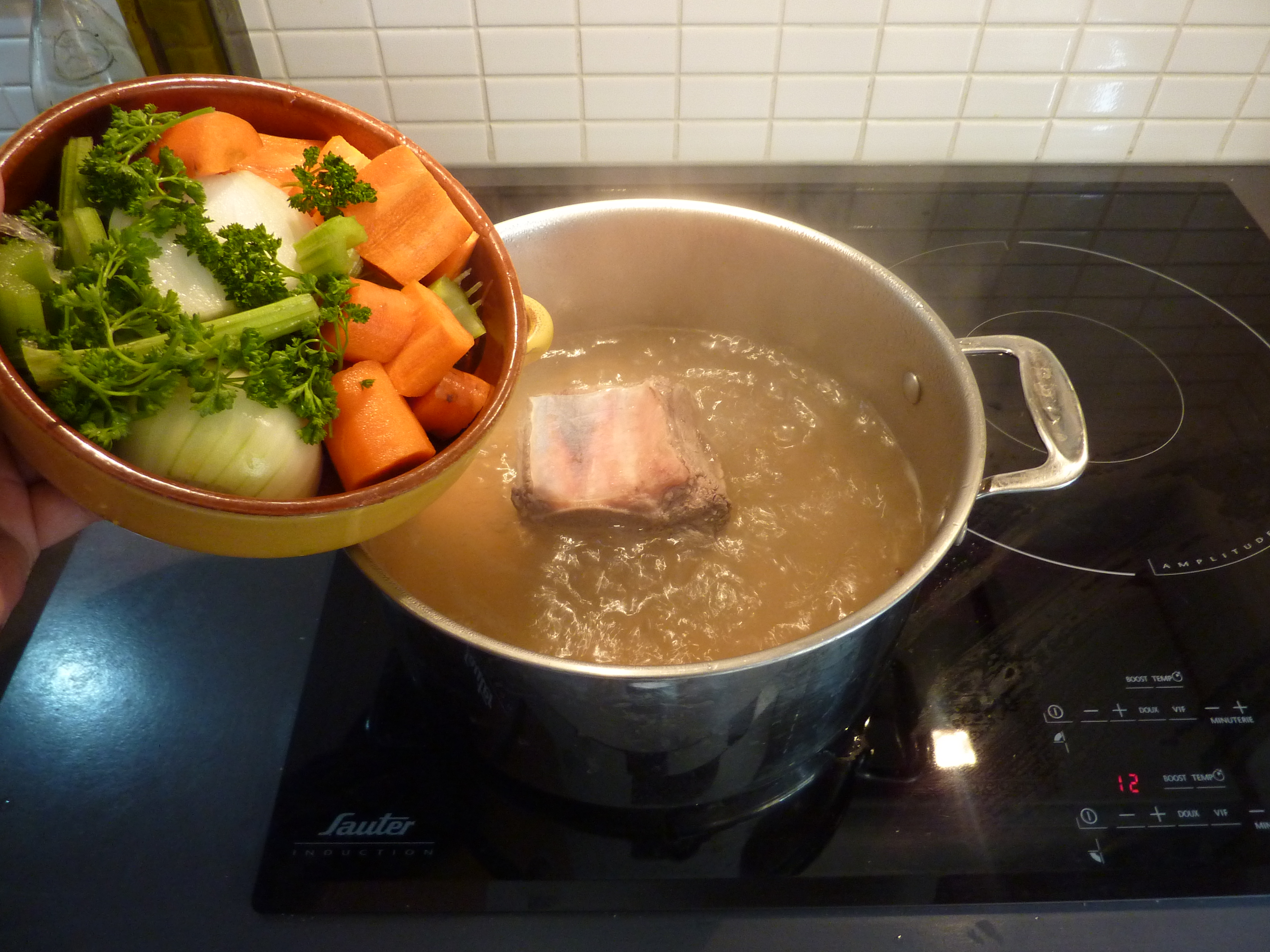 Mettons donc le tendron à cuire dans une casserole, avec un cube de bouillon de boeuf, plus les légumes coupés en morceaux. Il faut attendre que la viande soit attendrie, au moins une heure, voire davantage.