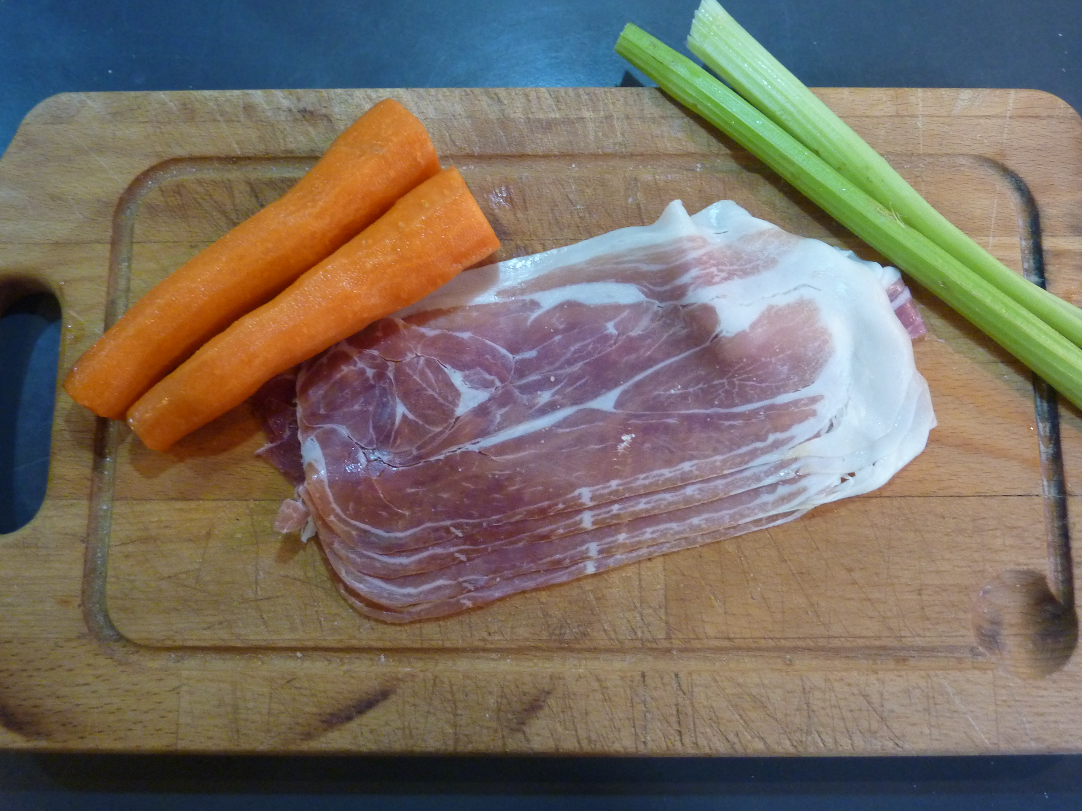 Pour compléter le tout, il faut : carottes, céleri, jambon cru, et du saindoux (‘nzogna, en napolitain). C’est le gras du porc, tiré de la colonne vertébrale de l’animal, privé de la couenne et coupé en petits morceaux. Une fois fondu, il est à nouveau solidifié, et utilisé (encore de nos jours) dans certaines recettes traditionnelles.