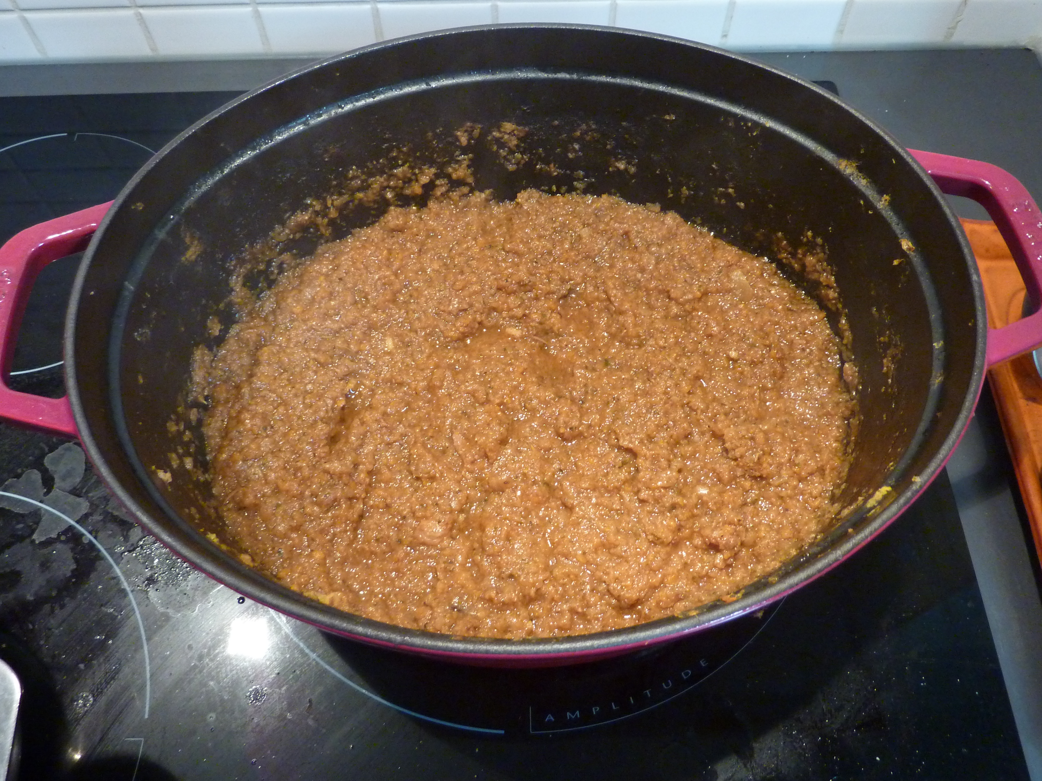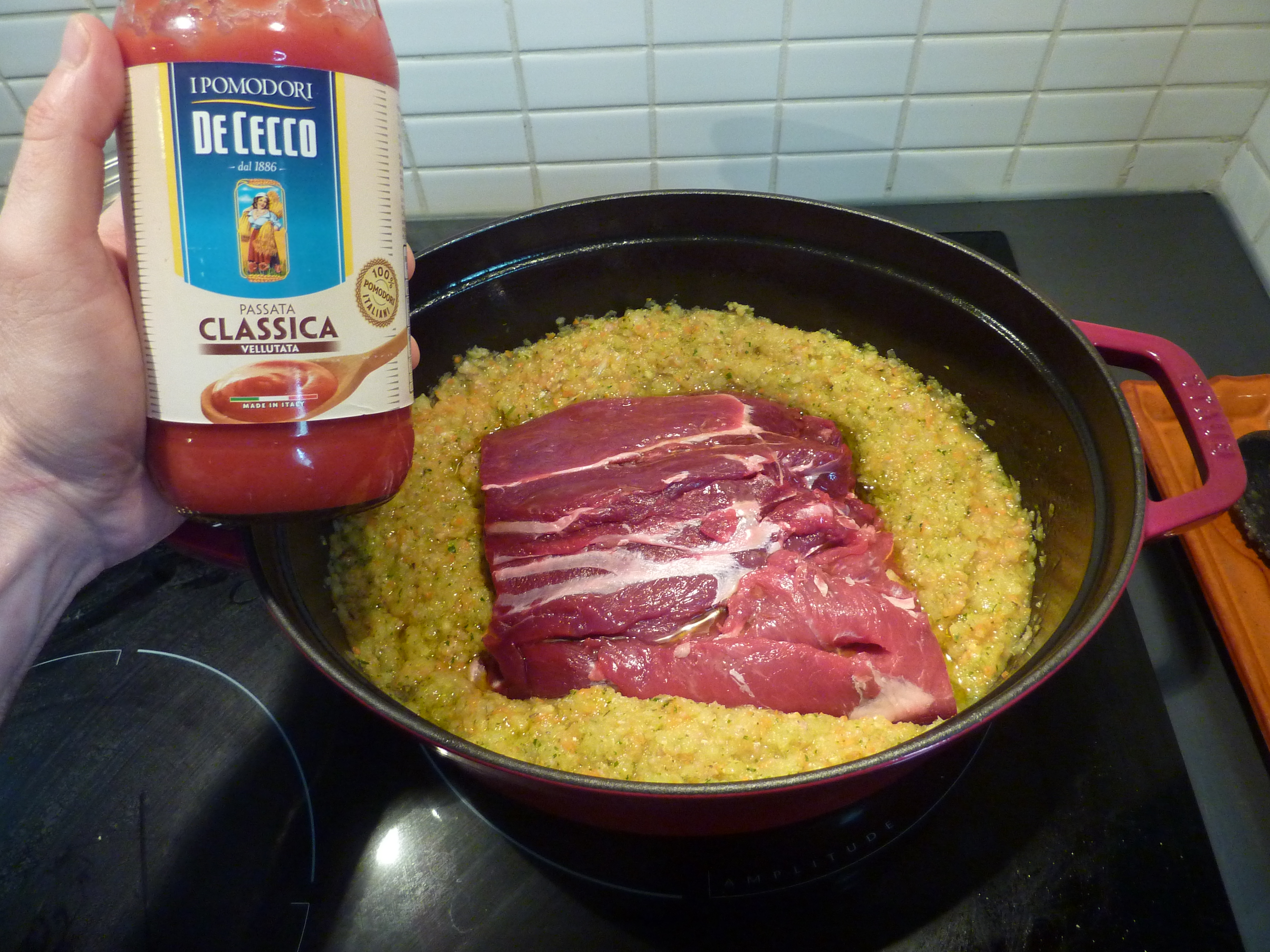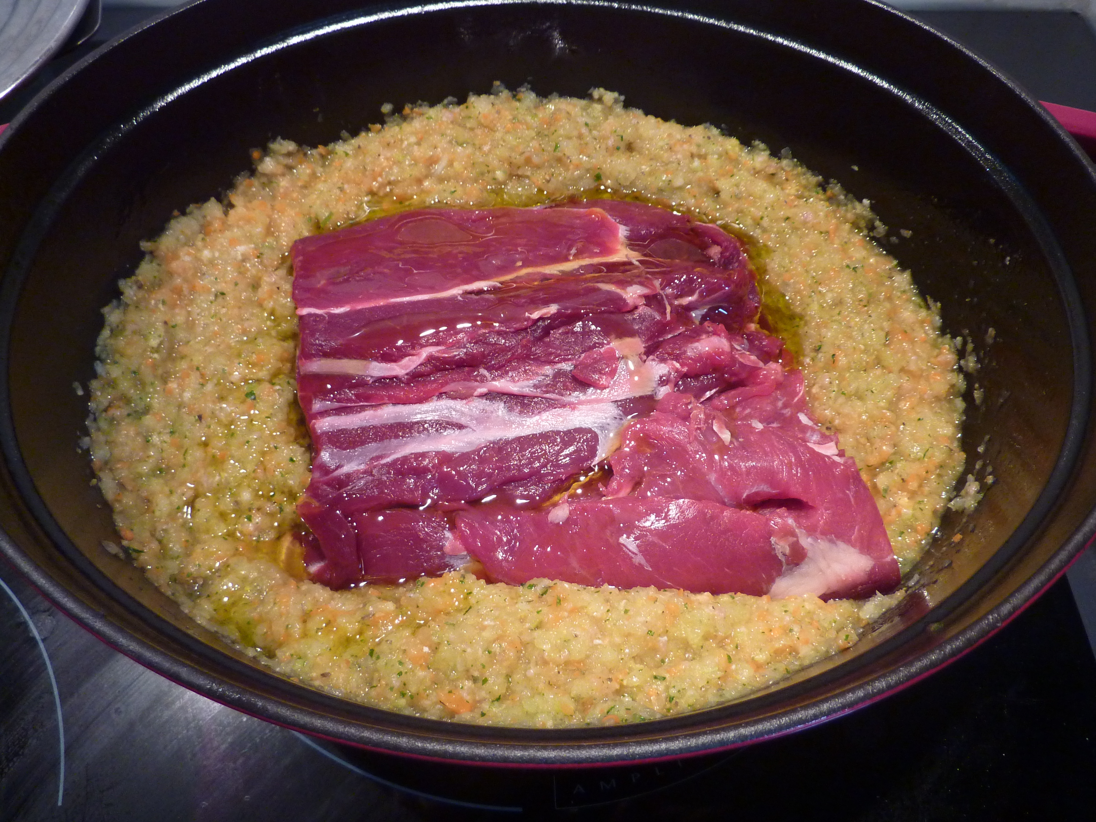Une fois le hachis doré, ajoutez le morceau de viande, avec quelques gouttes d’huile extra vierge d’olive, et faites cuire pendant quelques heures (entre quatre et cinque).