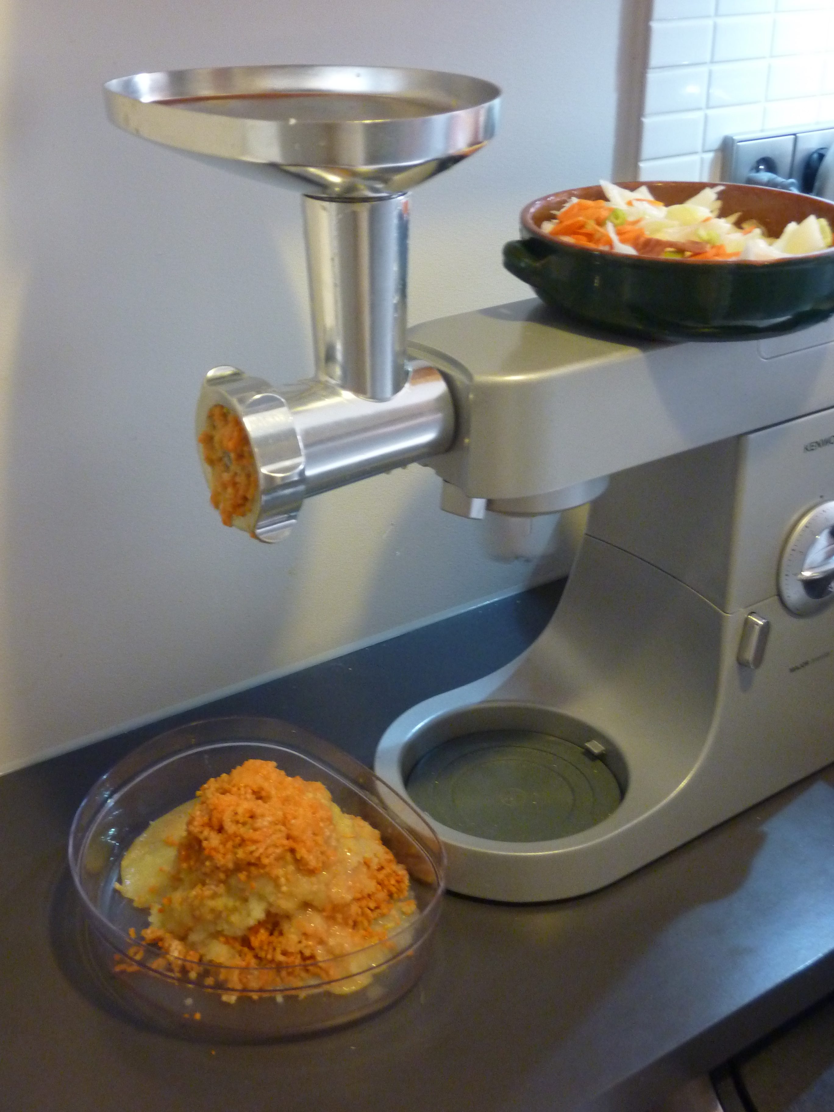 Commencez par éplucher les oignons, et laissez-les quelques temps dans un bol avec de l’eau froide. Après quoi, passez les avec le jambon, les carottes et le céleri, dans le hachoir.