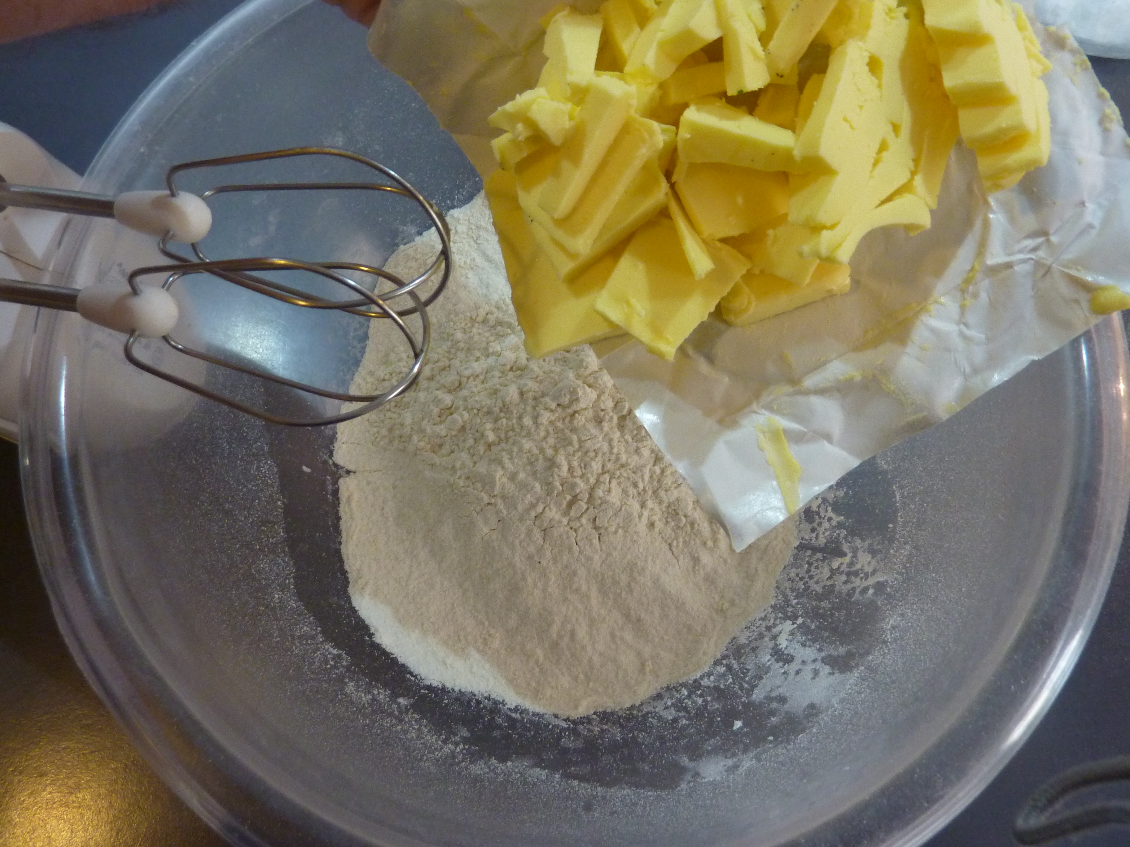 Il faut commencer par mélanger dans un bol la farine 45 (tamisée) avec du beurre en pommade, à l’aide d’un fouet électrique.