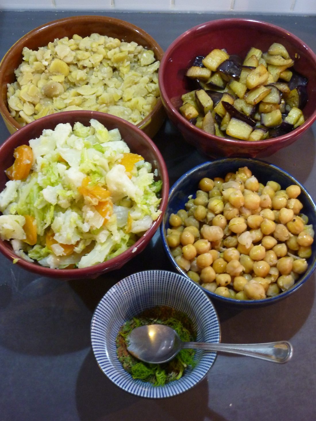 250 gr. de couscous à cuisson rapide (mais si vous vous sentez de taille à faire un vrai couscous…), 1/2 chou vert (sans ses feuilles externes); 1 petit chou fleur, 200 gr. de fèves et 200 gr. de pois chiches, 1 carotte, 1 aubergine (ou d’autres légumes de saison), 1 oignon, 1 gousse d’ail, 1 cube de bouillon, du fenouil commun, aromates mélangés, 1 clou de girofle, 1 baton de cannelle, de la marjolaine, sel, poivre, huile extra vierge d’olive