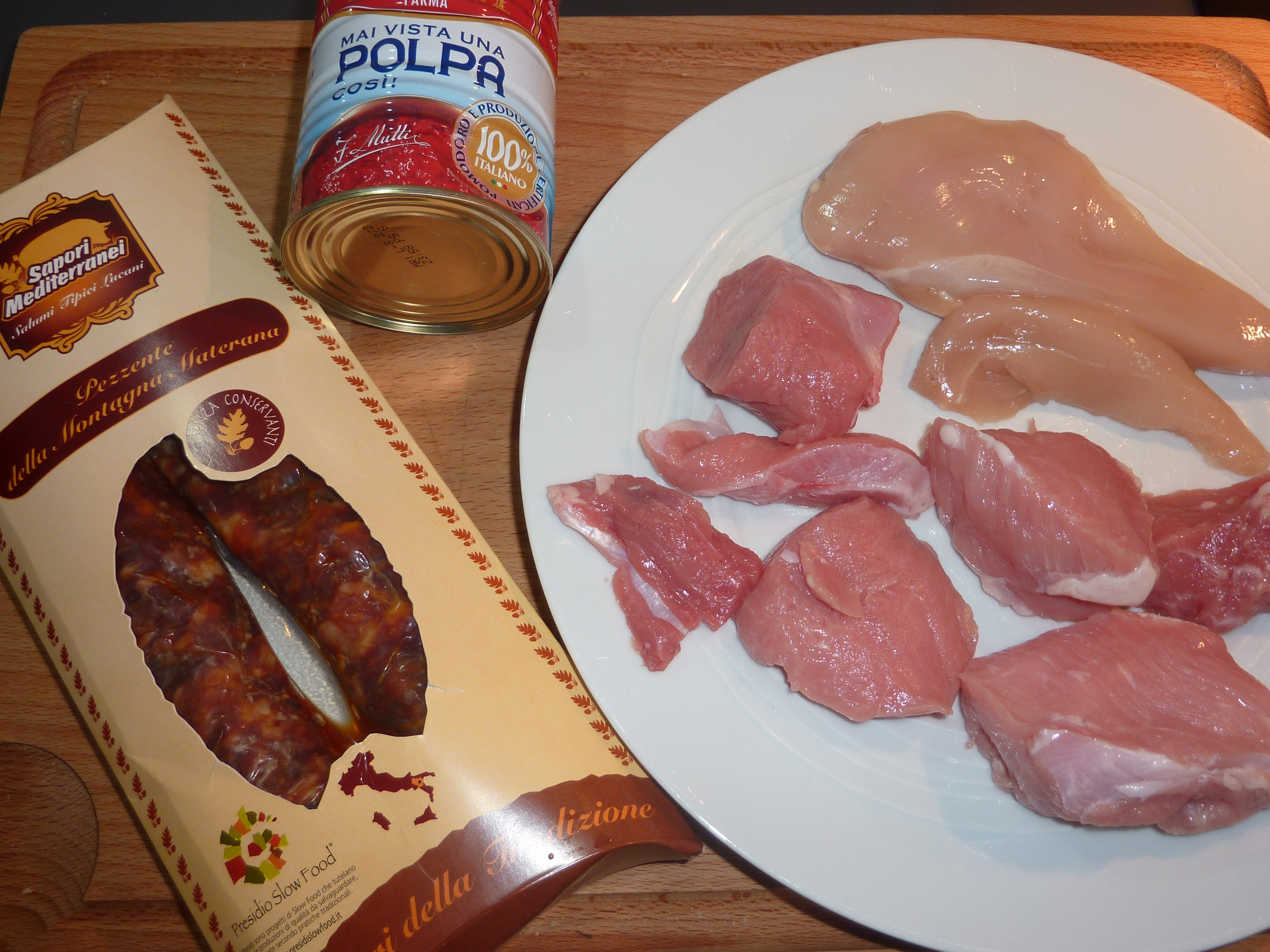 200 gr. de pâtes ferricelli, 200 gr. de pâtes orecchiette; 1 racine de raifort, 50 gr. de salame pezzente, 100 gr. de viande de veau (poitrine, collier, épaule), 100 gr. de poitrine de poulet (ou agneau, ou lapin); 1 boîte de tomates, 1 verre de vin blanc sec, 1 oignon, 1 gousse d’ail, aromates, huile extra vierge d’olive, sel, poivre, 1 cube de bouillon végétal.
