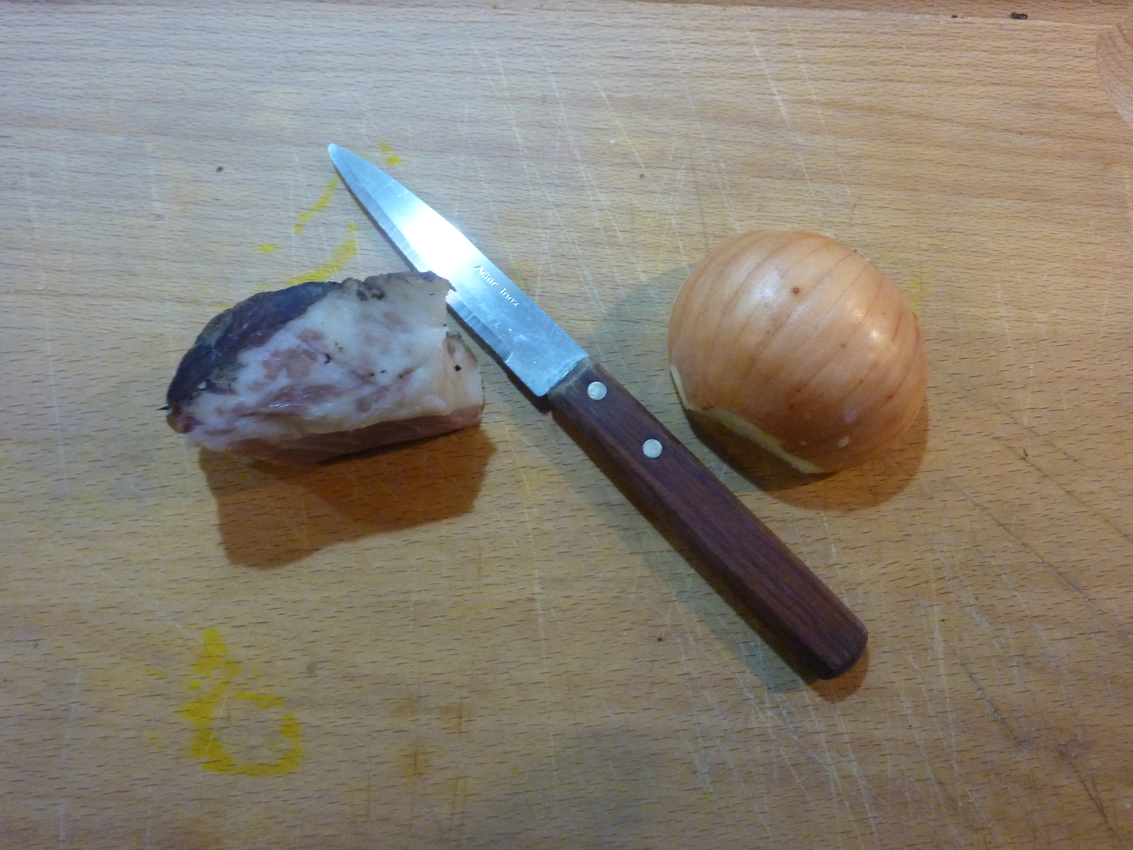 D’abord un morceau de guanciale (bas joues de porc) et un oignon, coupé finement.