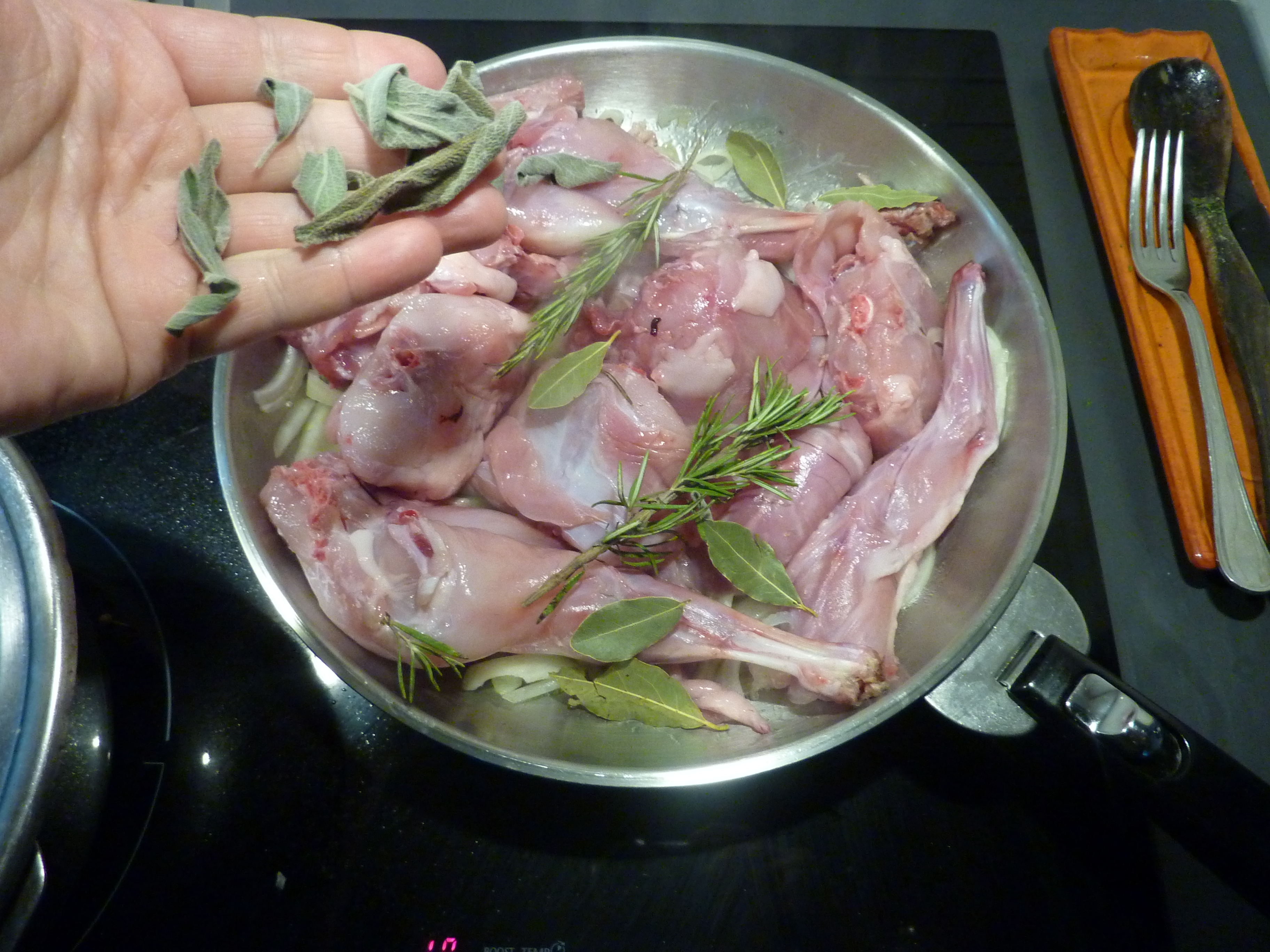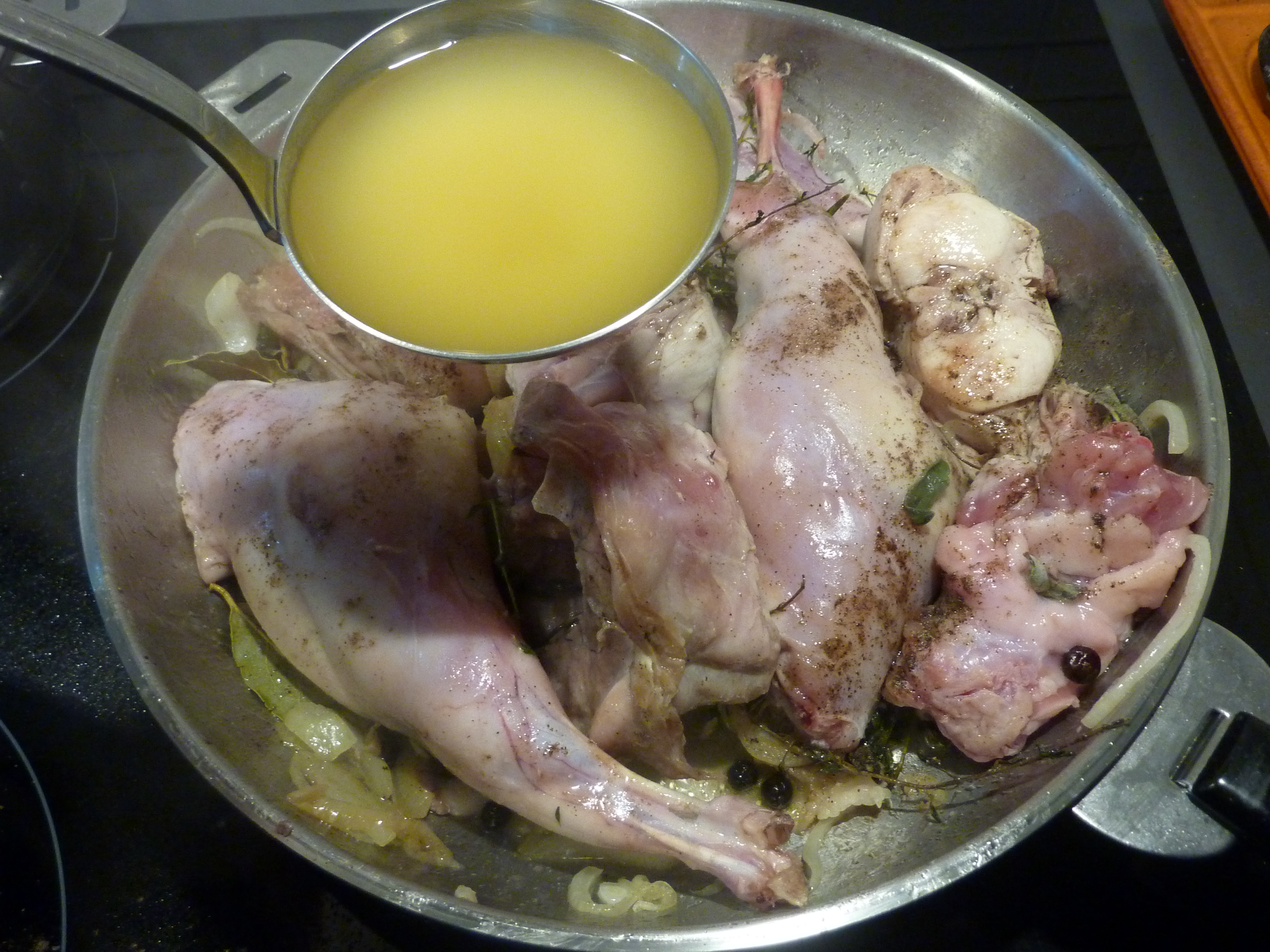 Quand ils auront changé de couleur, on ajoutera le lapin, vidé, lavé, coupé en morceaux, sans tête ni abats, mais avec du thym, du laurier, et des baies de genièvre. On laissera rissoler le lapin un moment, et puis on le mouillera avec un verre de vin blanc sec.