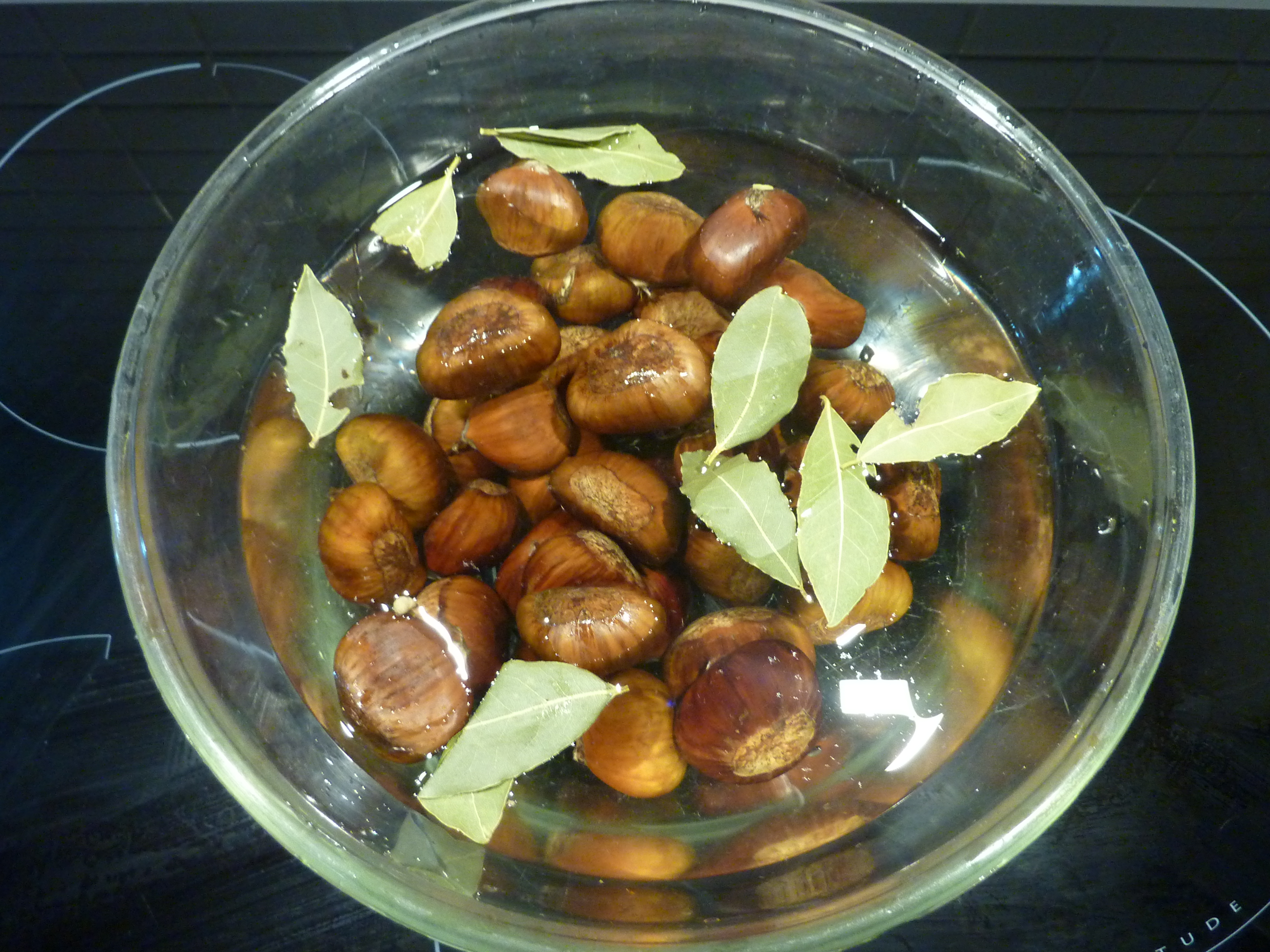 Troisième et dernière action, faisons bouillir les châtaignes pendant au moins quarante minutes, toujours avec les feuilles de laurier. Vous aurez ainsi le temps de préparer les autres ingrédients.