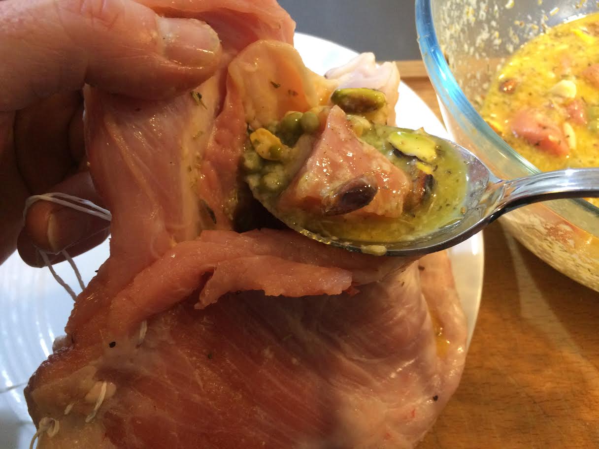 Le plat était constitué de pointe de poitrine de veau, cousue comme une poche et rempli avec, outre l’extérieur de rond (la cuisse) de veau, des ris, de la moelle épinière, de la cervelle, des testicules et même un morceau de pis de vache. Le tout, mélangé avec du parmesan râpé, des blettes, des petits pois, des carottes, un oeuf, de l’ail, des pignons, de la mie de pain, de l’huile extra vierge d’olive, du sel, du poivre, du persil et de la marjolaine !