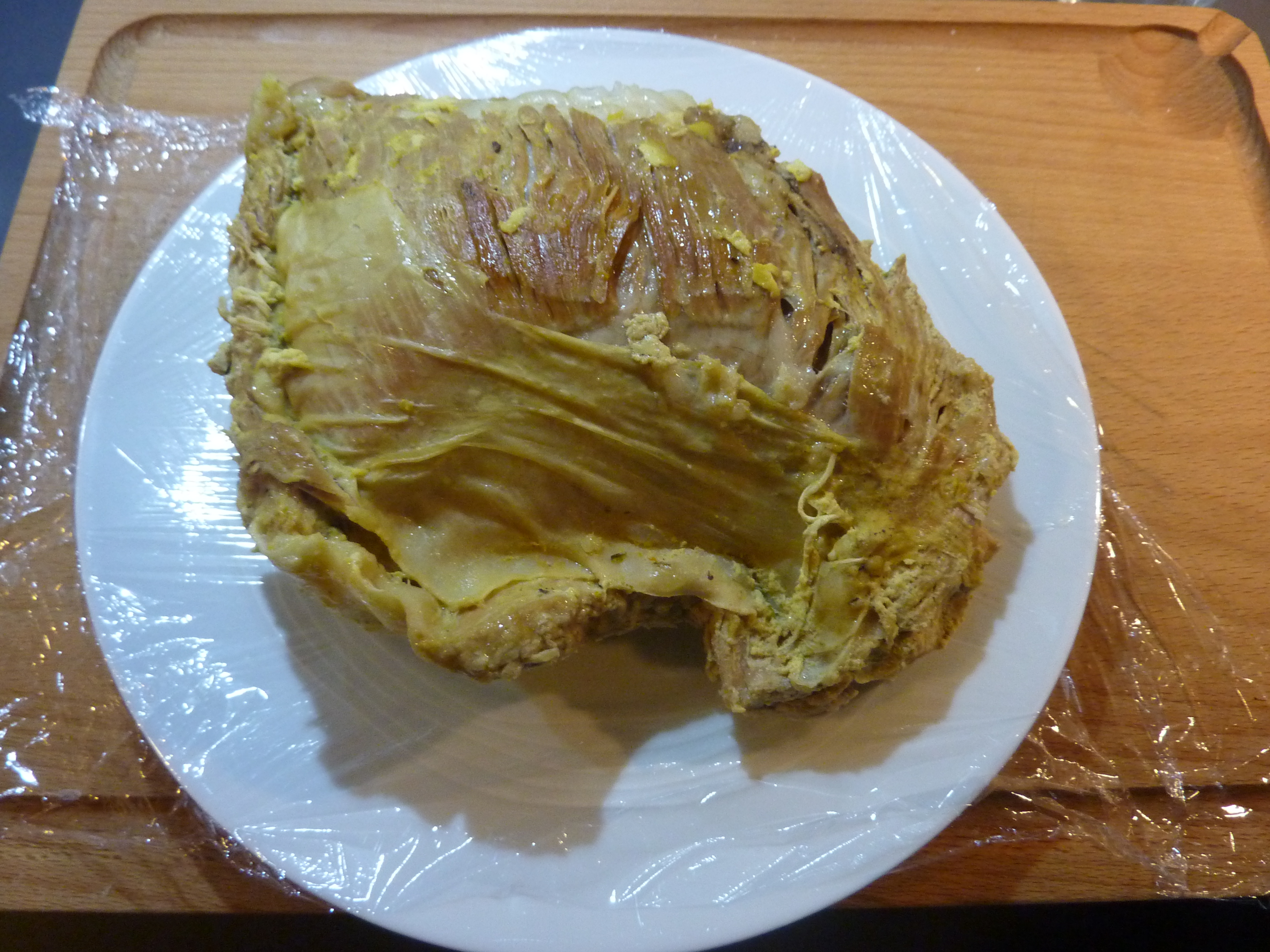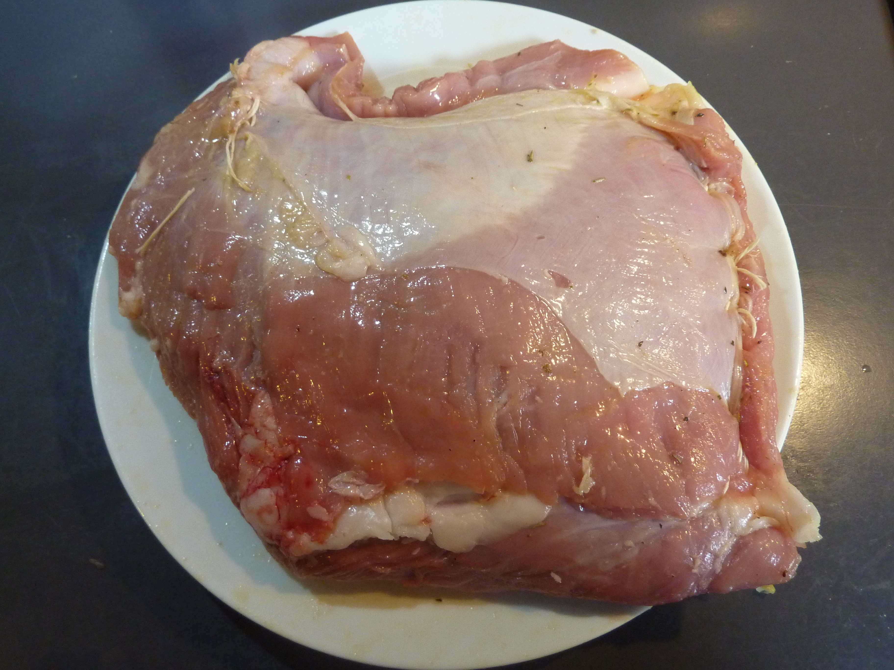 Mais revenons à la recette. Puisque je ne me sentais pas de taille, j’ai opté pour une version light, sans abats, en gardant seulement le morceau de ronde. J’ai aussi fait coudre les côtés de la poitrine par mon boucher. La poche était donc prête à être remplie.
