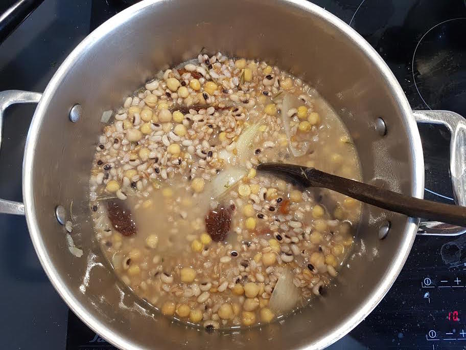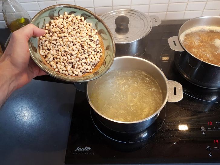 Pour rendre cette soupe plus savoureuse, vous pouvez ajouter des tomates séchées (qu’il convient de faire tremper dans un bol d’eau tiède), un piment rouge et un morceau de bajoue de porc. Quoi qu’il en soit, les trois types de graines devront tremper une nuit entière dans un bol plein d’eau (un pour chacune). Pour les ramollir, on peut verser une cuillère de bicarbonate de sodium dans l’eau mais point trop n’en faut, car les graines risqueraient de se défaire totalement. Elles devront, quoi qu’il en soit, être cuites séparément avec un cube végétal.