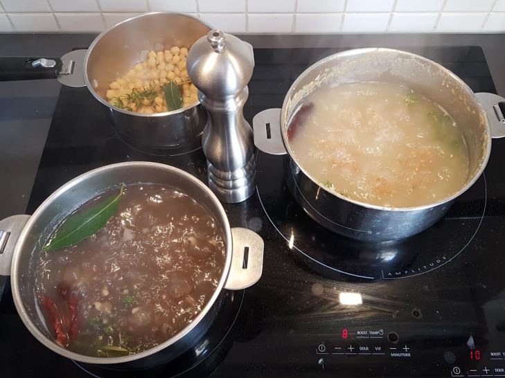 200 g. de pois chiches, 200 g. de haricots, 200 g. d’épeautre, huile extra vierge d’olive, sel, poivre, (au choix) tomates séchées, piment rouge, ail, aromates, bajoue de porc, cubes végétaux.