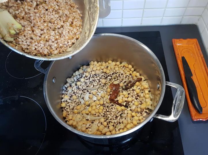 Une fois les trois graines cuites, conservez un peu d’eau de cuisson de l’une ou l’autre, et commencez à mélanger les pois chiches avec les haricots.