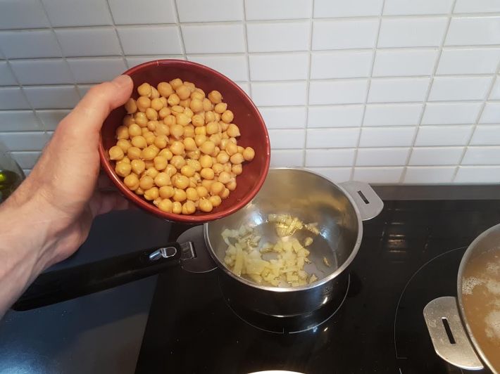 Pour relever le goût, j’ai aussi fait revenir un oignon dans un peu d’huile extra vierge d’olive, avant d’y ajouter l’eau et les pois chiches.