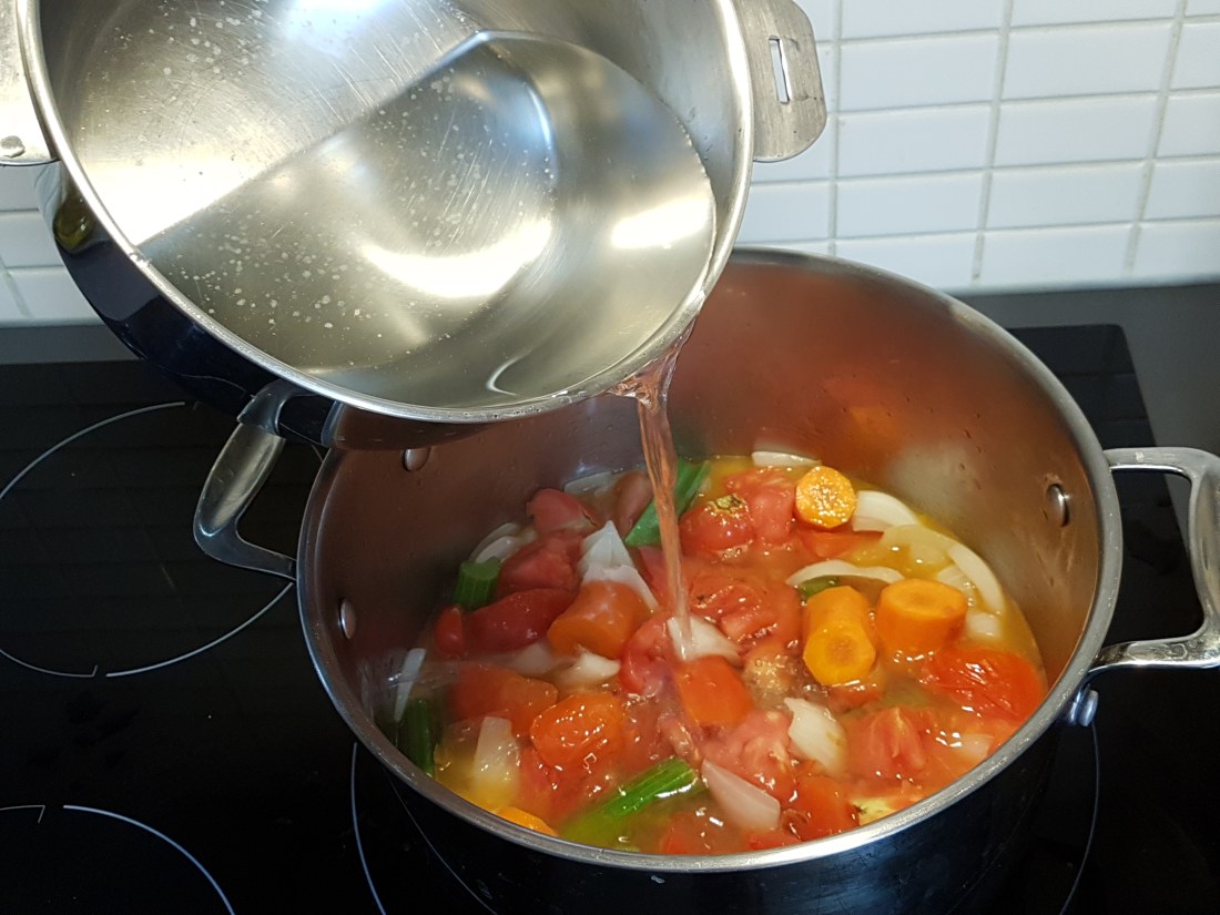 Ajoutez l’eau, salez, poivrez, et laissez mijoter à feu doux pendant au moins une heure.