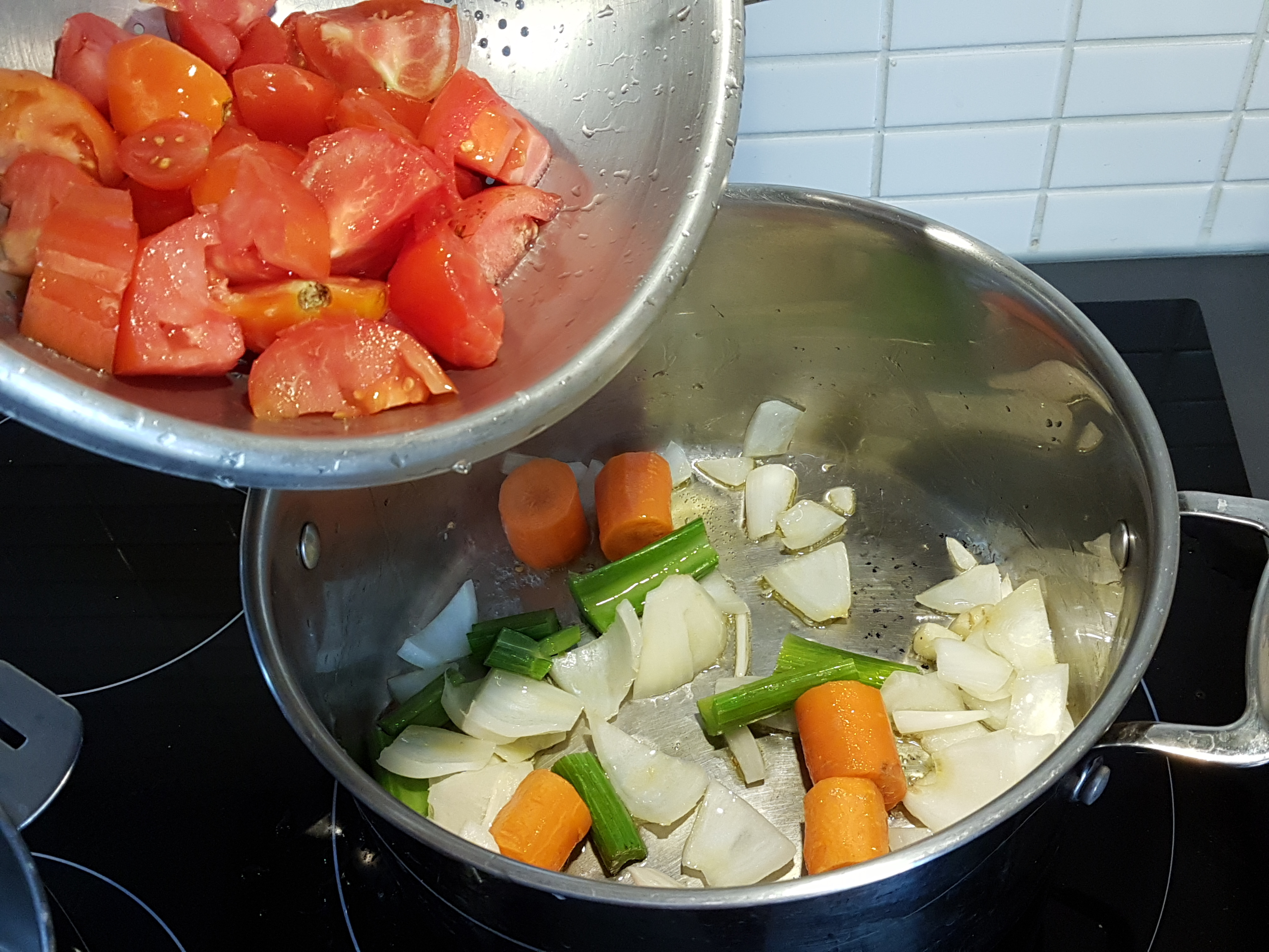 Faites frire dans de l’huile extra vierge d’olives les légumes, et ajoutez des tomates fraîches, plus le piment.