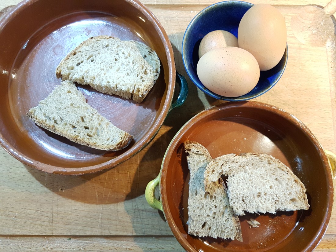 Vers la fin de la cuisson (la soupe doit réduire de façon considérable), mettez de coté les oeufs, et grillez les tranches de pain.