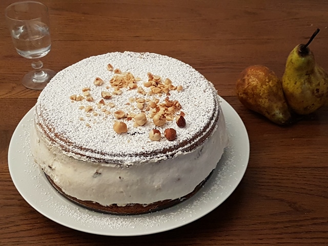 Les « disques » de farine de noisettes étant prêts, prenez-en un comme base, et recouvrez-le avec la ricotta, la crème et les poires. Nivelez le tout…