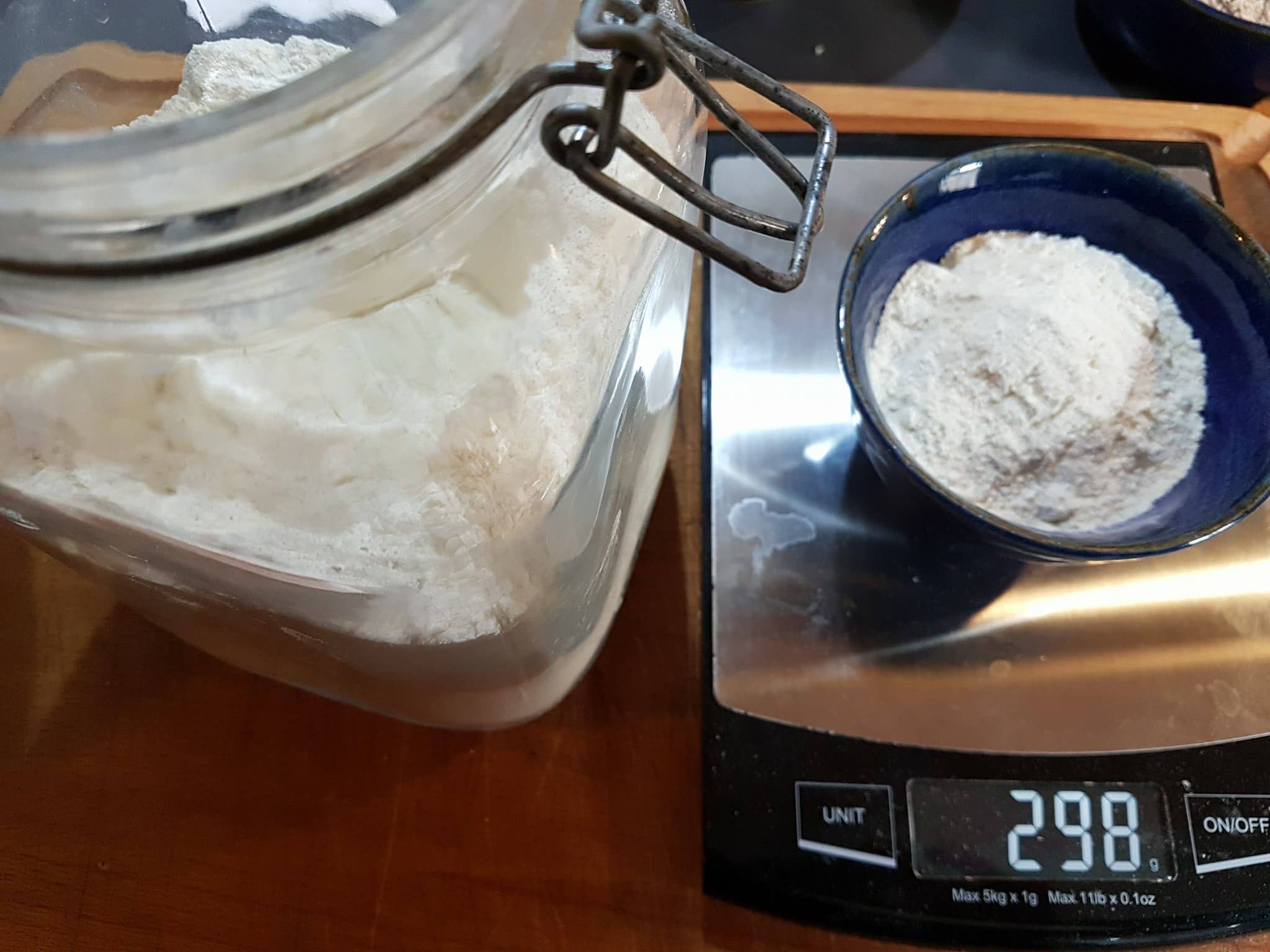 pour les deux biscuits = 140 g. de farine de noisettes, 100 g. de sucre, 80 g. de beurre, 50 g. de farine 45, 4 oeufs, 1 sachet de levure pour gâteaux
