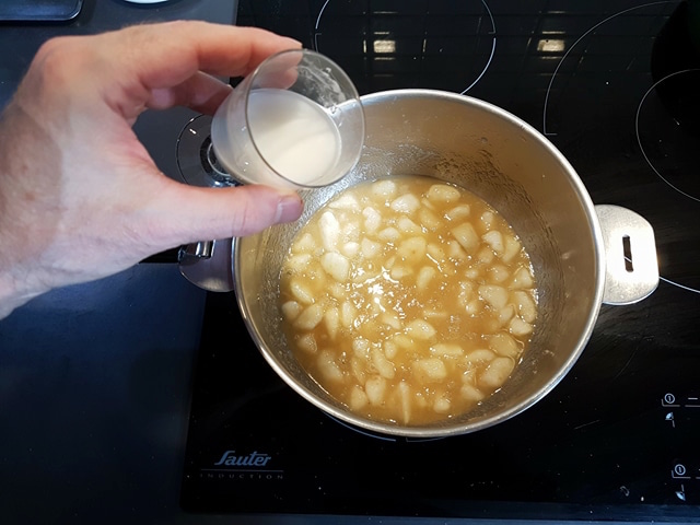 Fini ? Pas encore. Il faut aussi ajouter de l’amidon de maïs (maizena) dilué dans un verre avec de l’eau de vie de poire. Mélangez, faites réduire et faites reposer.