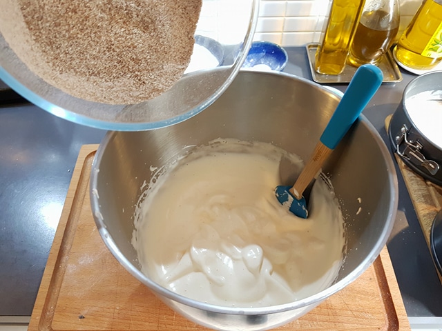 Mélangez ensuite dans un robot mixeur les oeufs avec le sucre pendant 15 minutes. Ensuite, ajoutez les farines et un sachet de levure pour les gâteaux, en malaxant à l’aide d’une spatule du bas vers le haut.