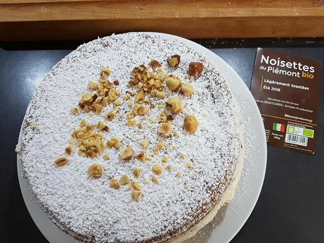 Le moment venu; saupoudrez de sucre glacé le disque du haut, et parsemez-le avec des noisettes entières et/ou en grenaille. Là aussi, il faudra faire avec le moyens du bord…