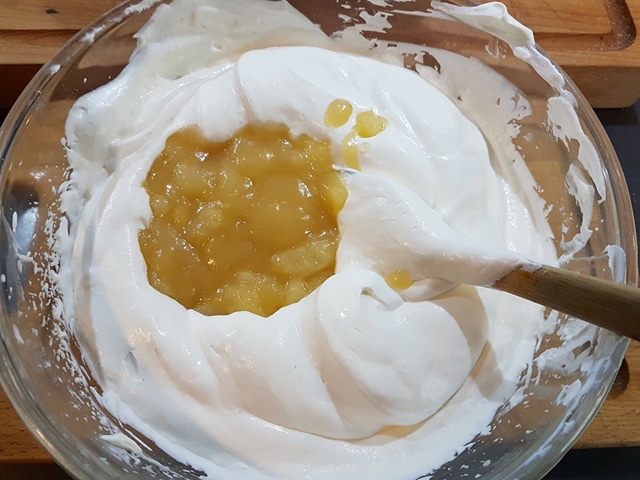 Mélangez la crème fleurette à la ricotta en plusieurs fois, du bas vers le haut, et puis intégrez les poires en morceaux. Mettez le tout au frigo pour quelques minutes.
